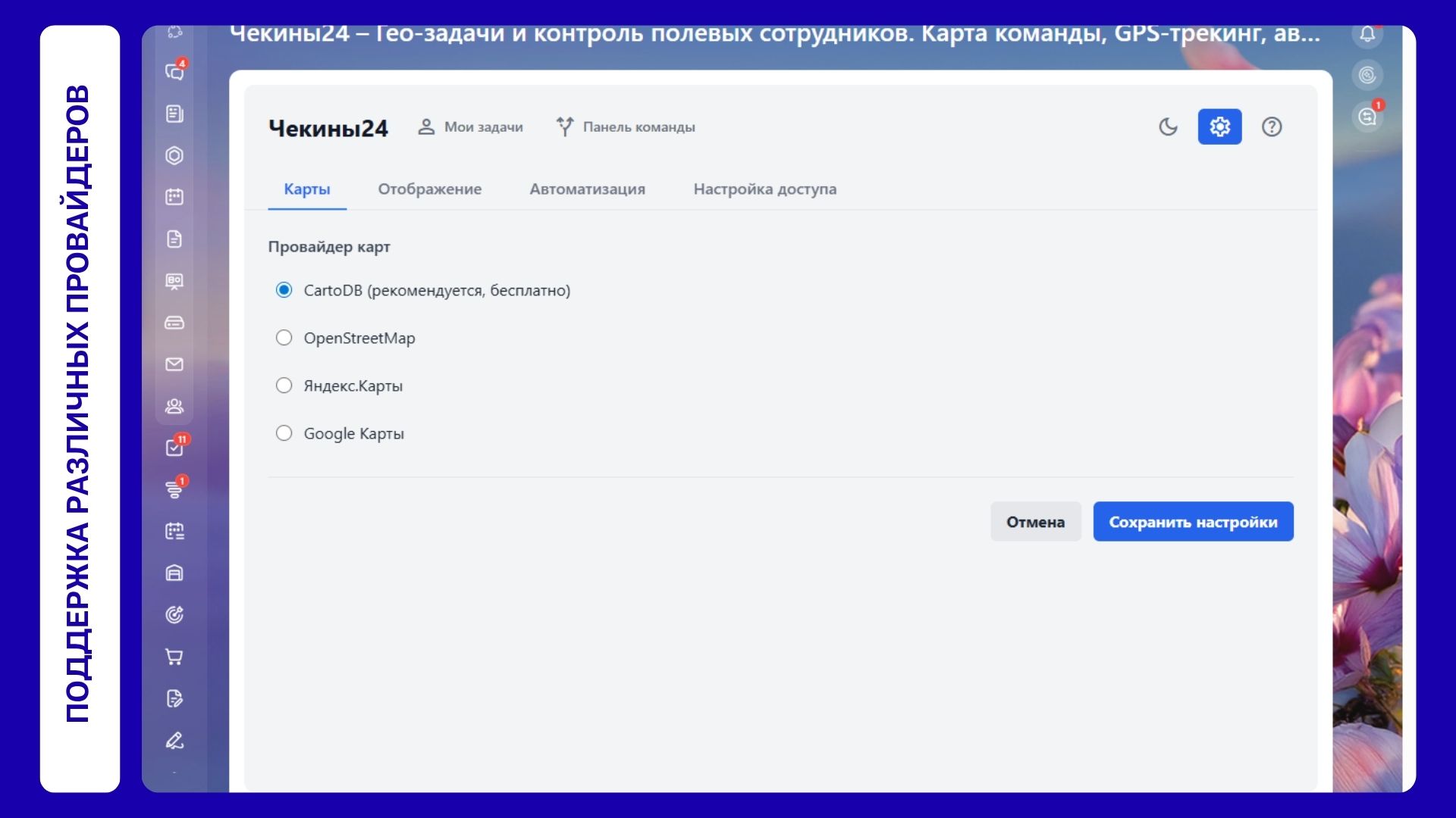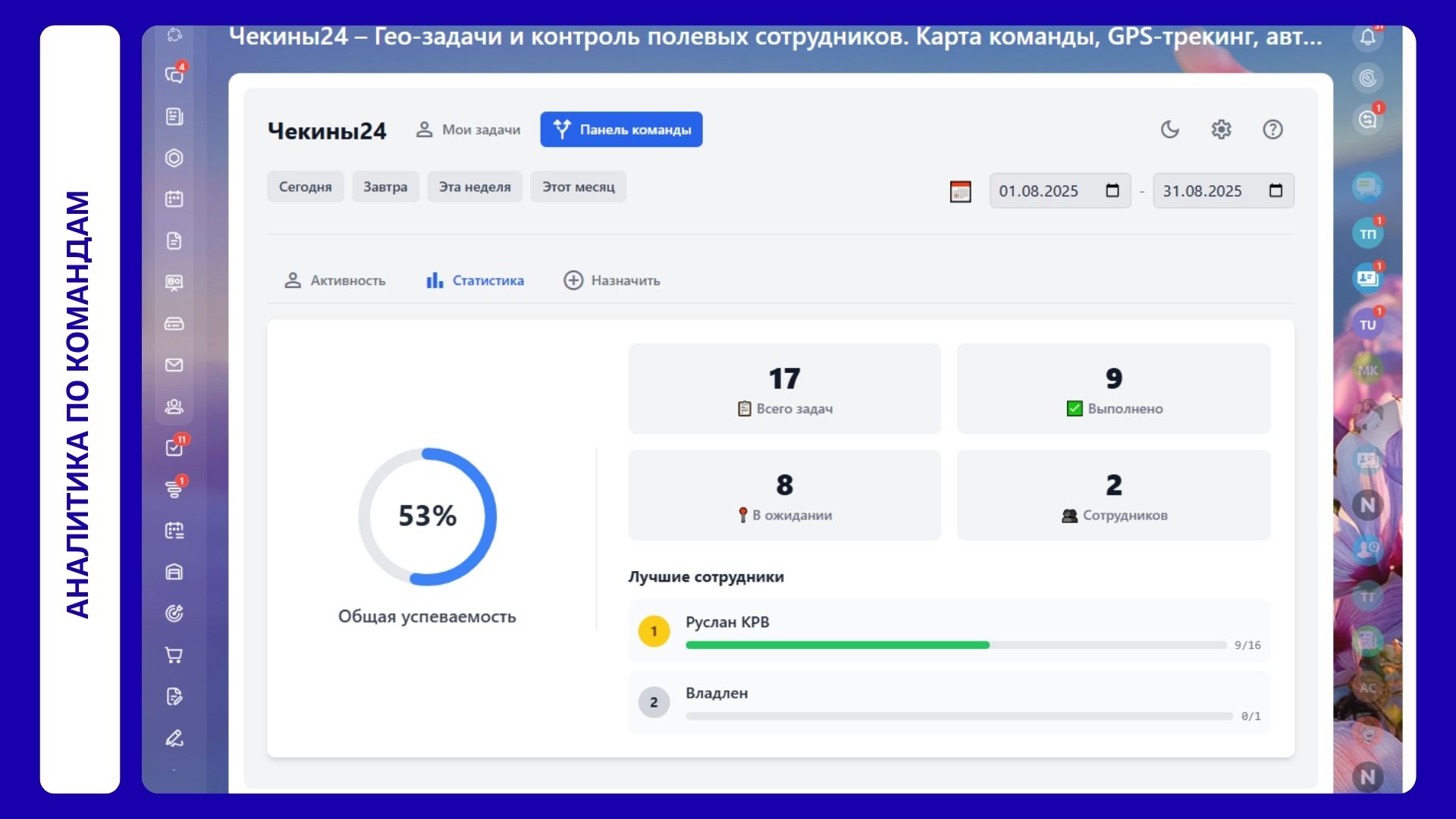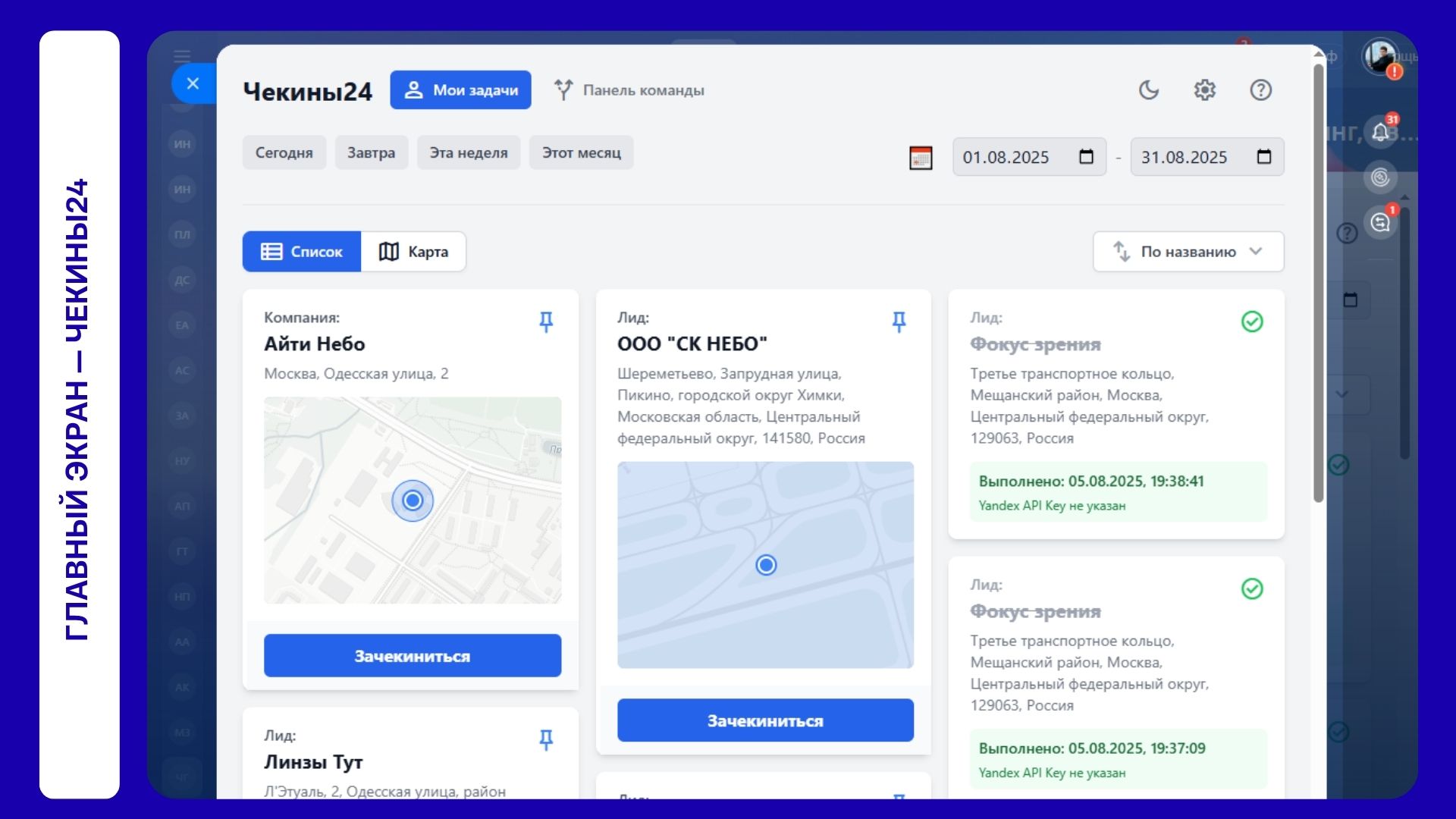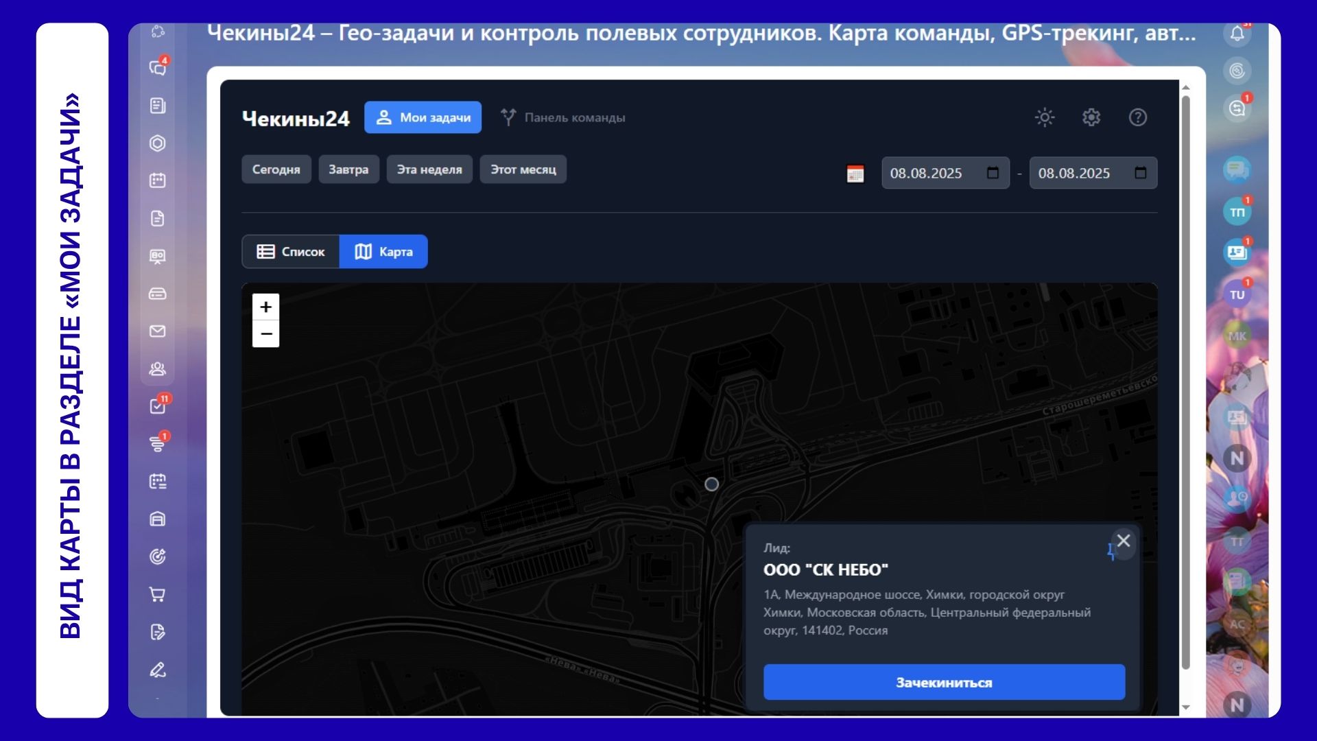 Чекины24 – Гео-задачи и контроль полевых сотрудников. Карта команды, GPS-трекинг, автоматизация по чекину