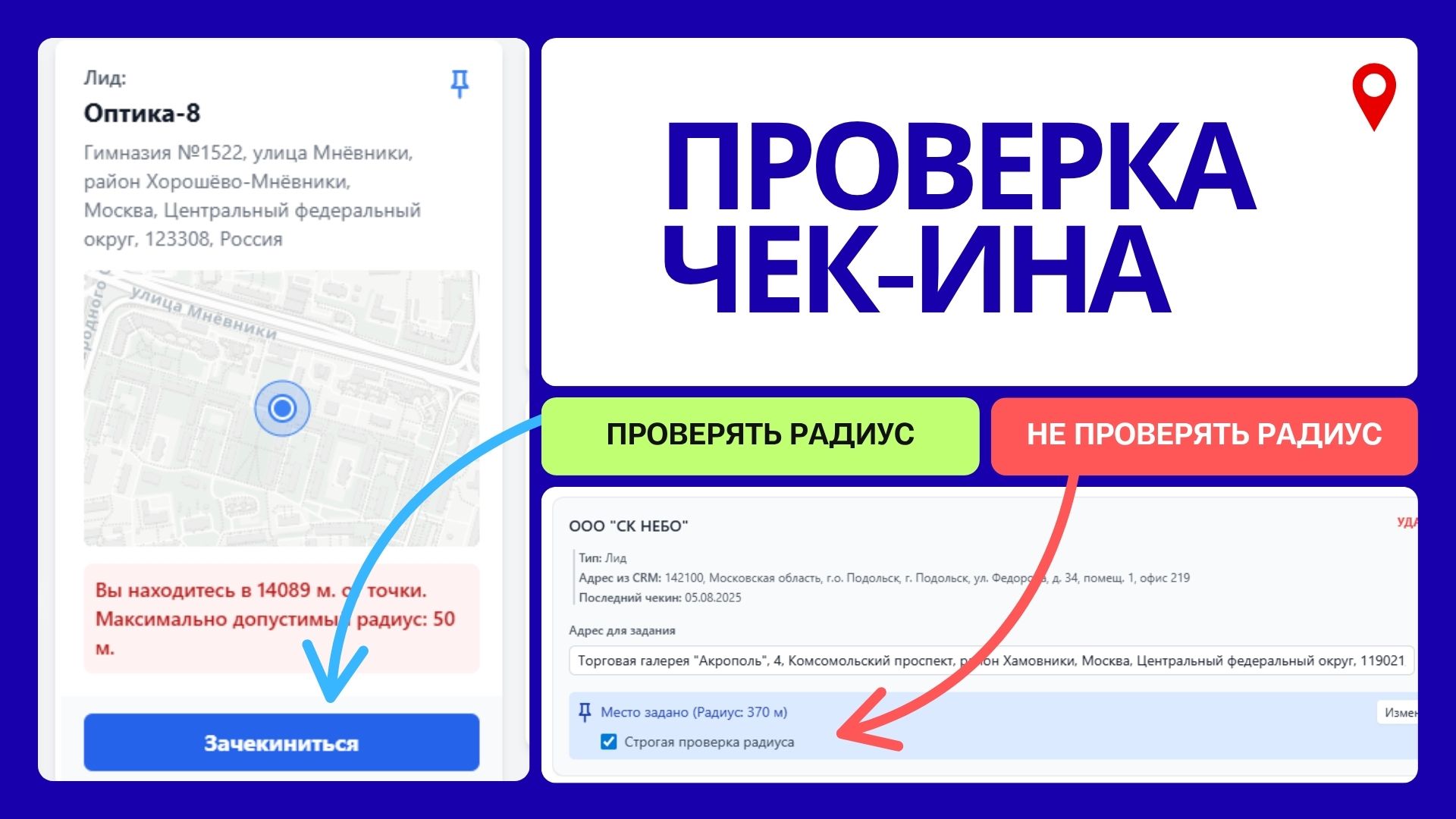 Устанавливайте точные гео-зоны: Укажите на карте конкретную точку для визита и задайте допустимый радиус (от 10 до 500 метров). Включите "строгую проверку", чтобы чекин был возможен только внутри этой зоны.