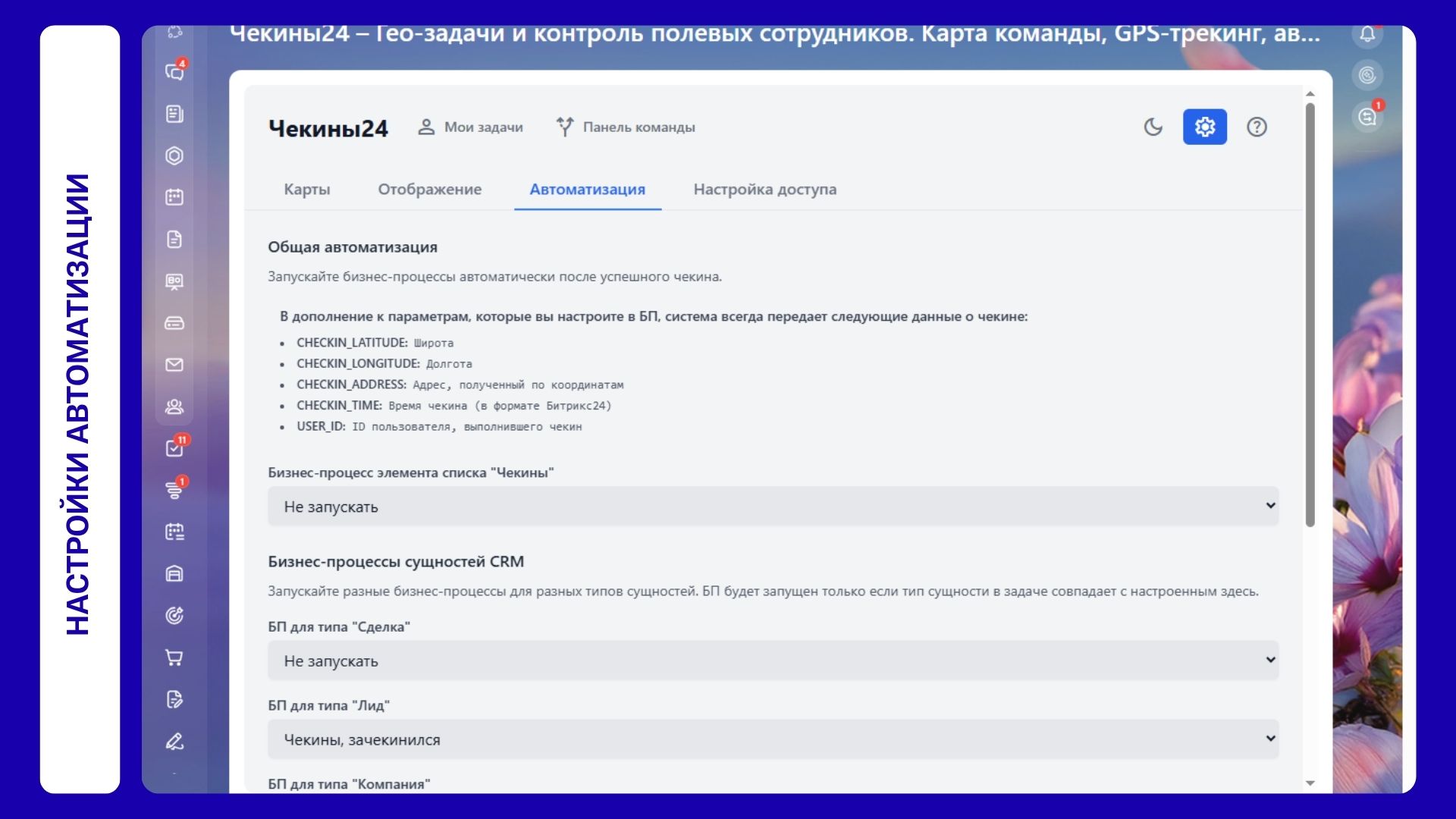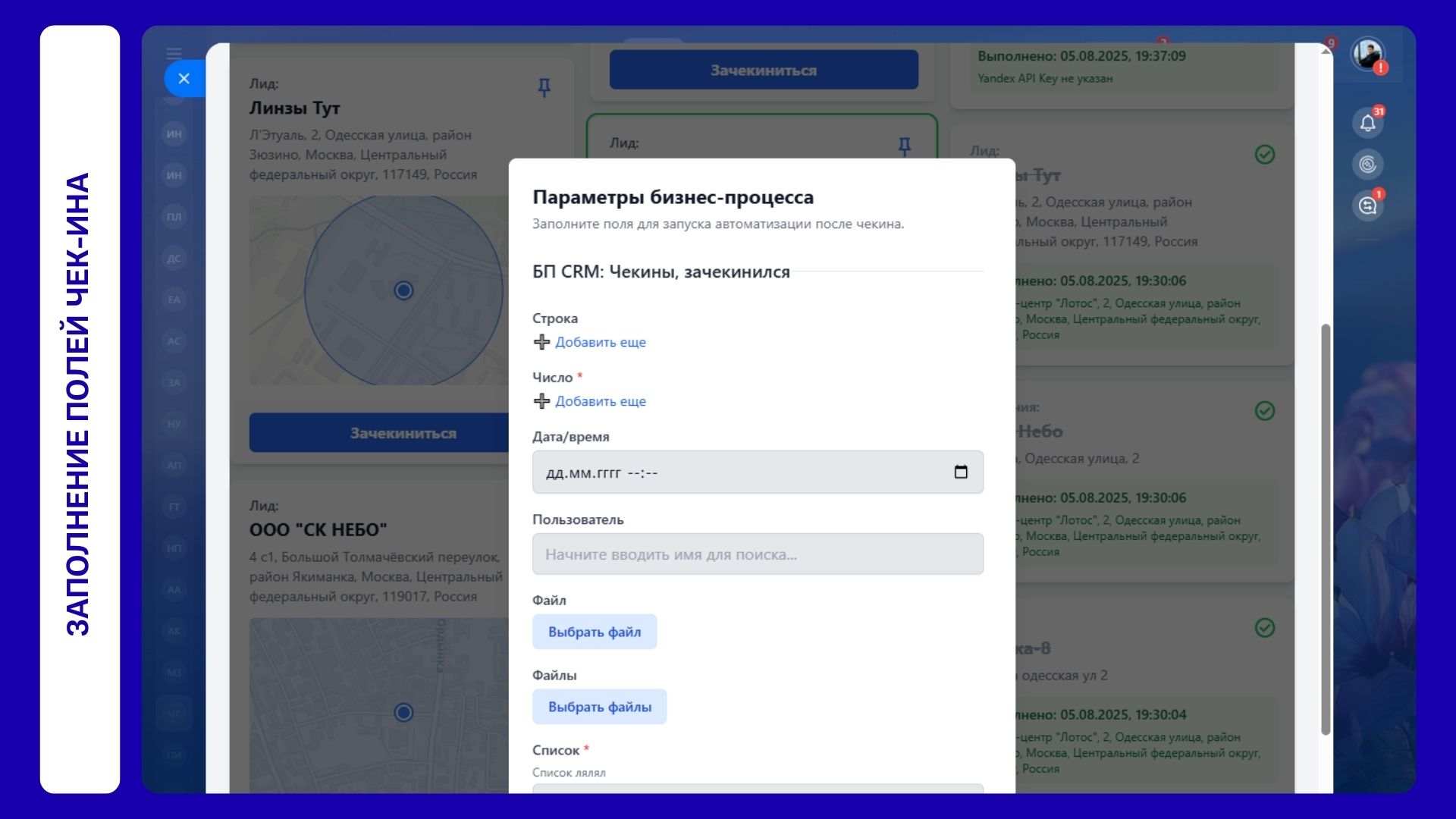Запуск бизнес-процессов: Сделайте чекин не просто отметкой, а триггером для дальнейших действий. После успешного визита приложение может автоматически запустить любой настроенный вами бизнес-процесс.