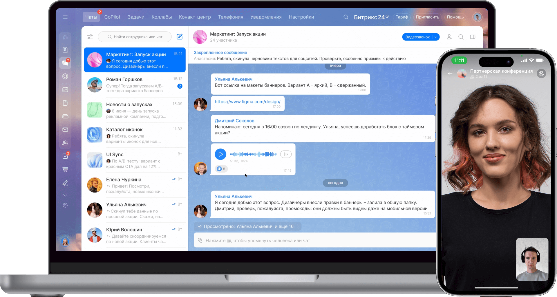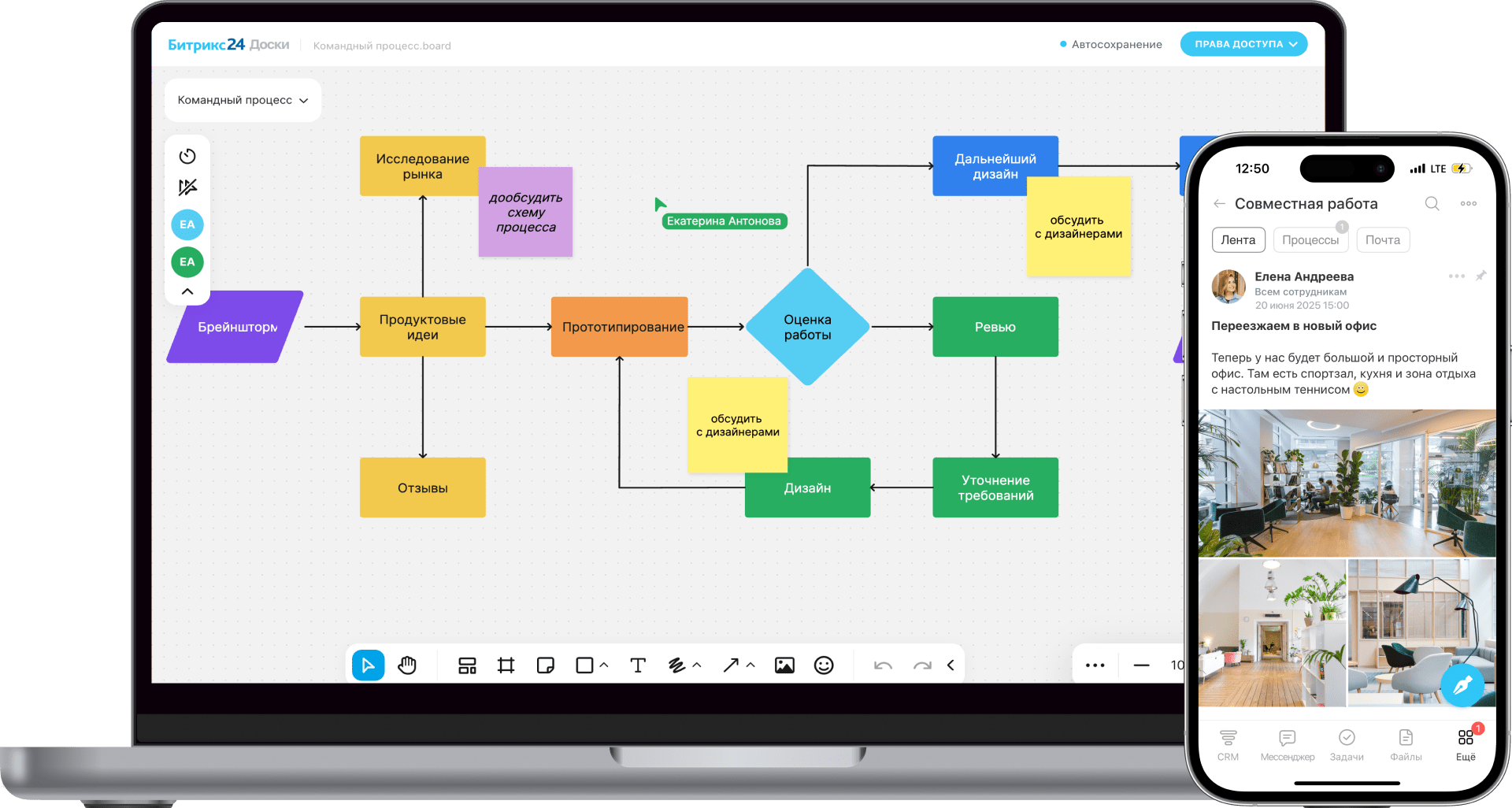 - общаться в бизнес-мессенджере, созваниваться по видео в Битрикс24 Синк, одновременно работать на онлайн-доске;