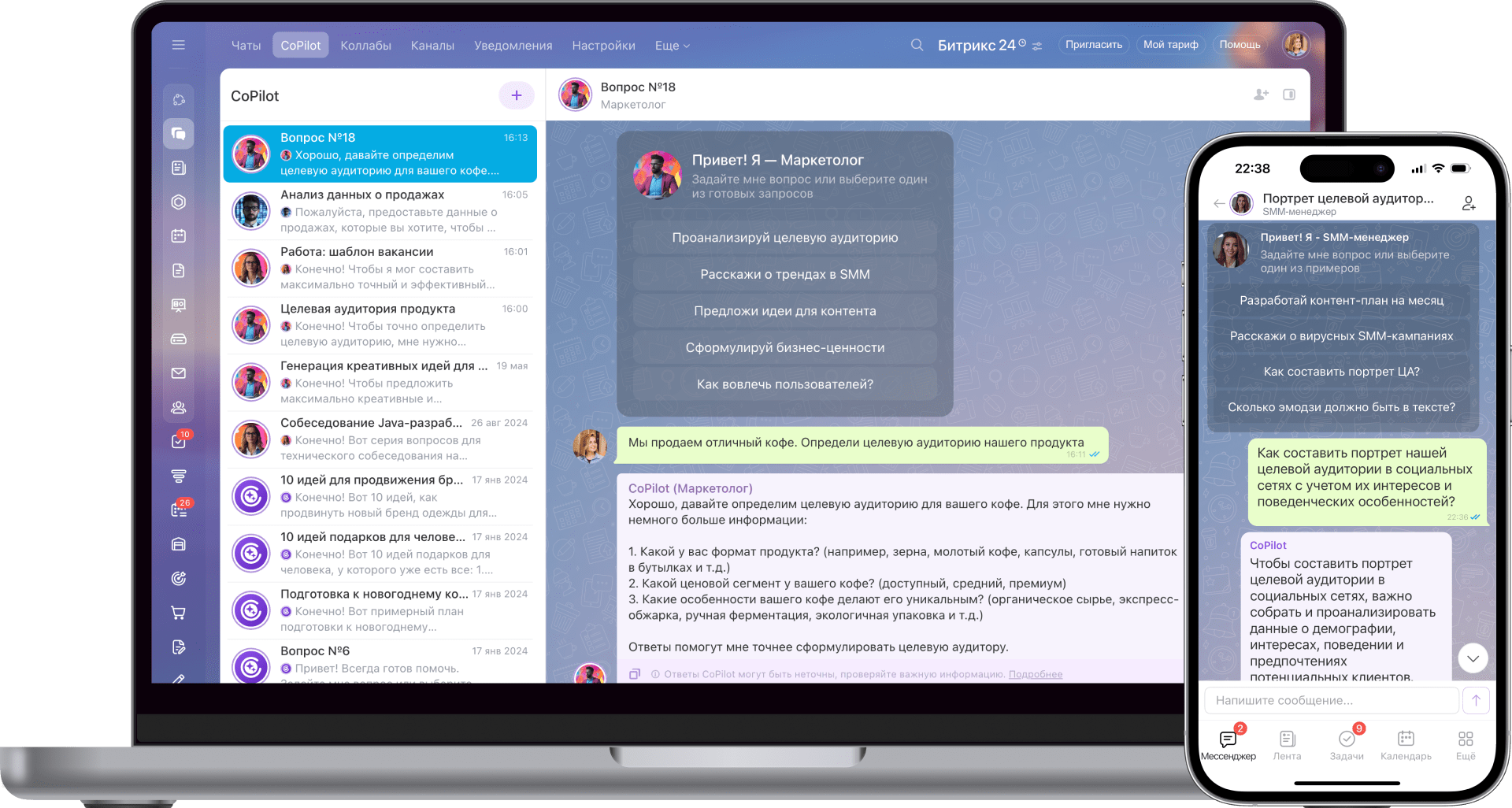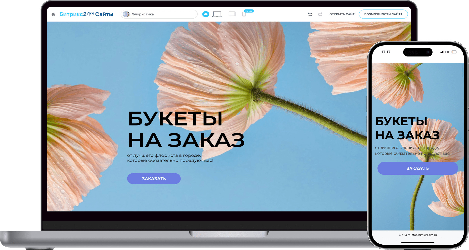 Создавайте продающие сайты и лендинги без кода с помощью простого конструктора. Используйте CoPilot для генерации текстов, изображений и даже целых сайтов. Добавьте форму заявки и онлайн-чат — обращения мгновенно попадут в Битрикс24, а менеджеры оперативно их обработают.