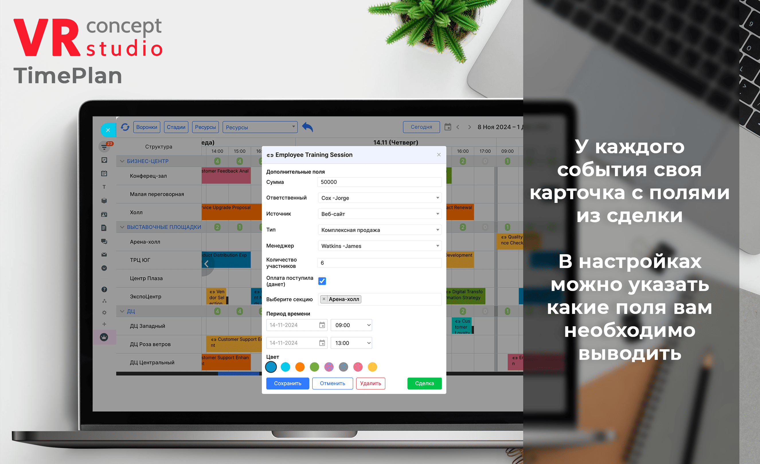 У каждого события в календаре есть своя карточка. В этой карточке можно заполнять сразу же поля, которые связаны с вашими сделками. Выбирайте какие поля отображать в приложении и работайте с ними.