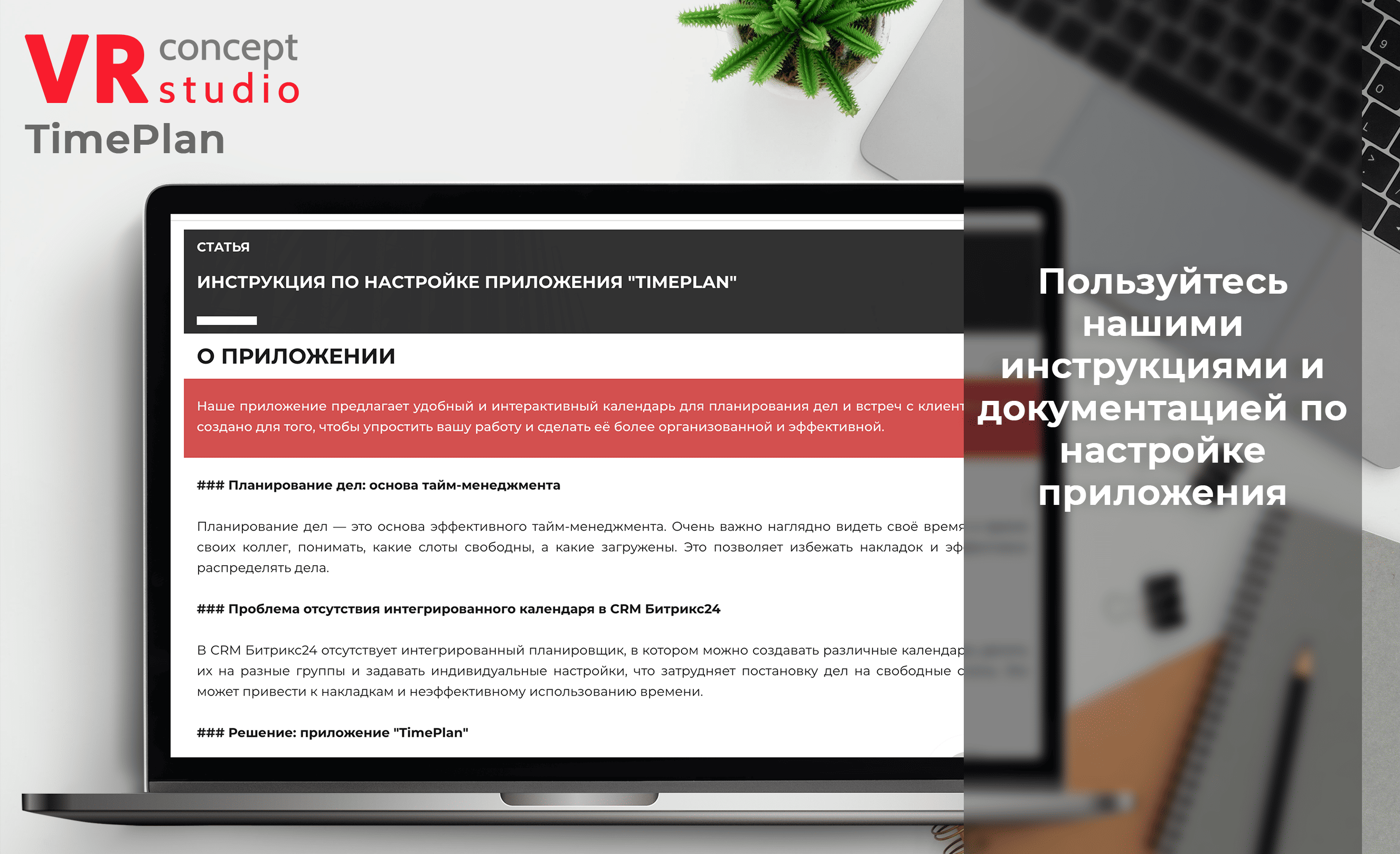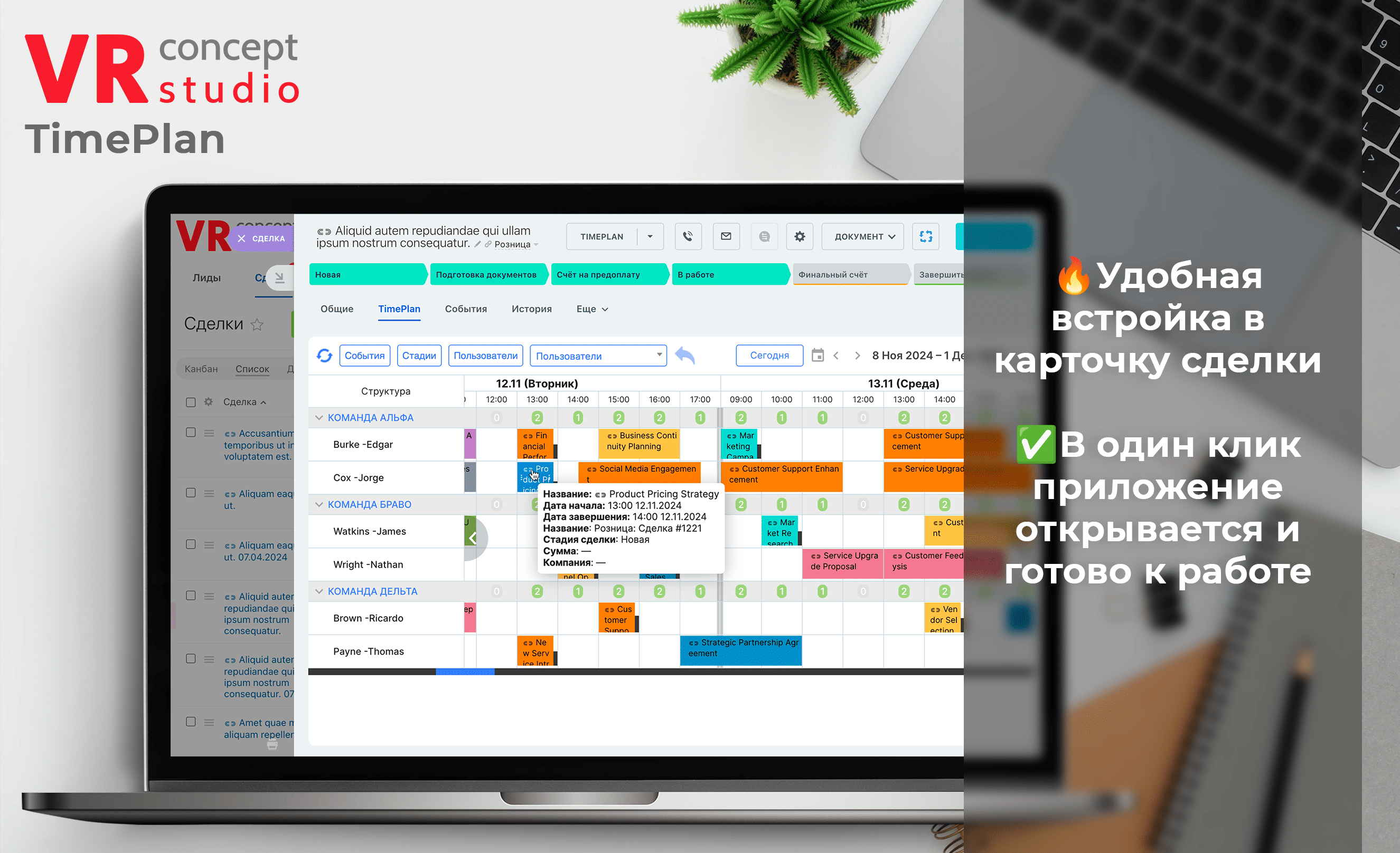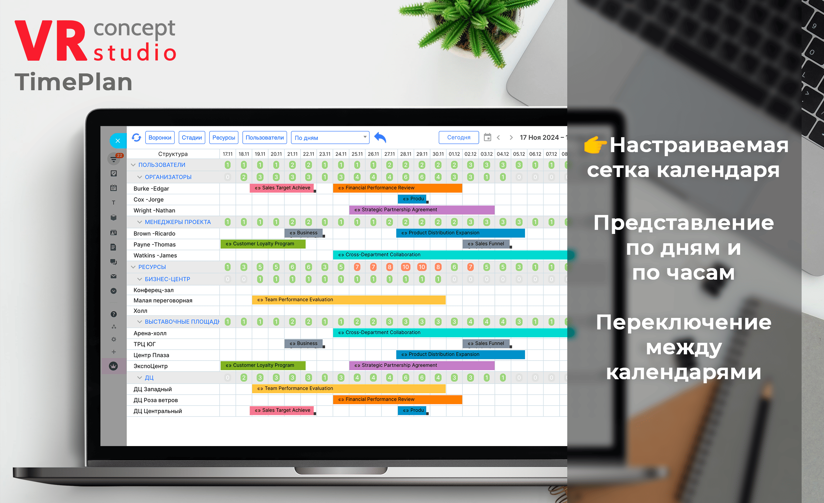 Удобное планирование для бронирования ресурсов, записи клиентов, управление временем сотрудников, учет аренды и многое другое позволяет реализовать TimePlan в вашем Битрикс24.