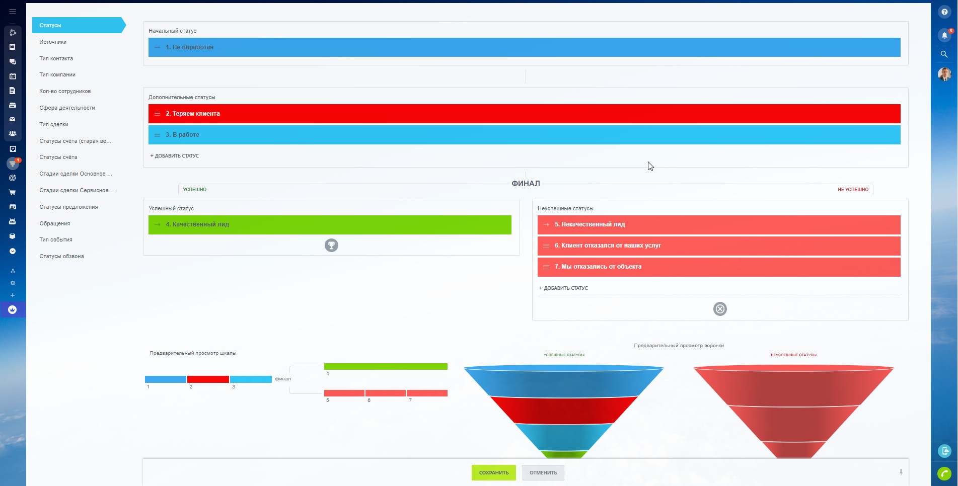 В готовом решении используется этап ЛИДов для фильтрации поступающих заявок по принципу: "клиент/не клиент". Также менеджер принимает решение, в каком направлении будет создана сделка.