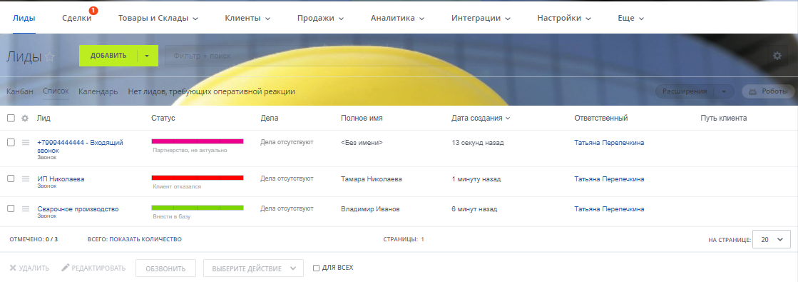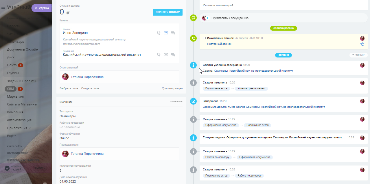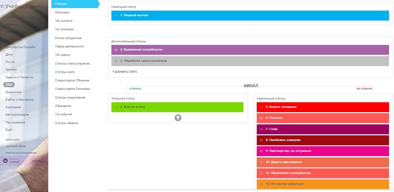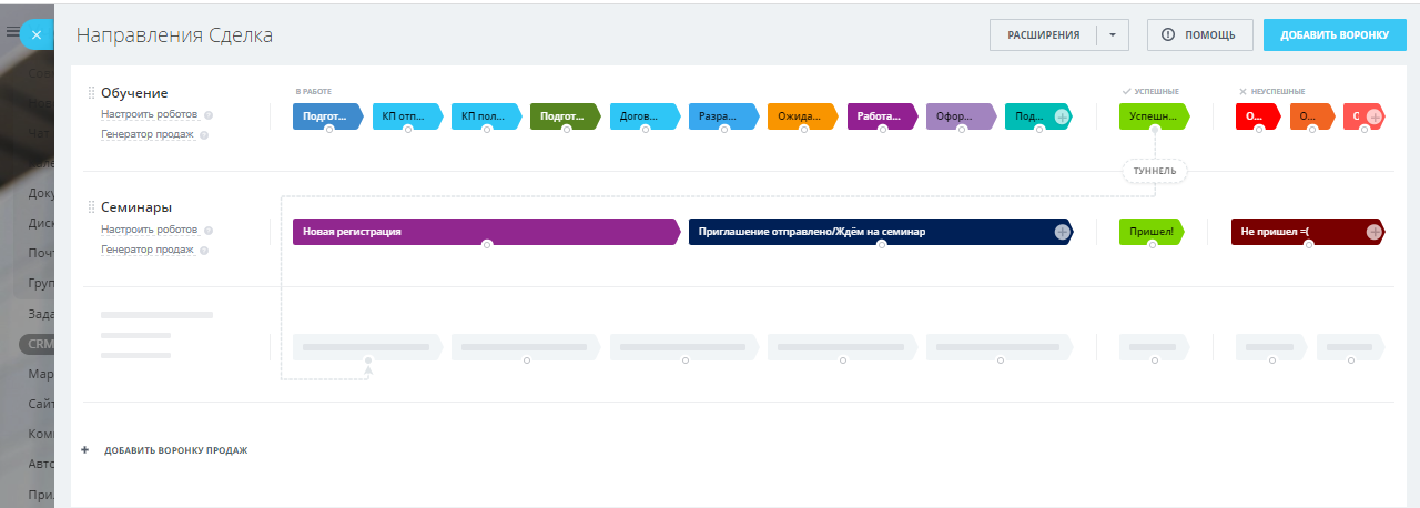 Если у вас тарифы из архивной линейки, например, Старт+ и Задачи+, вам будет доступна основная воронка - работа с лидами и сделками главного направления "Обучение", настроенные карточки лида, контакта, компании и сделки со всеми дополнительными полями. А на тарифах CRM+, Команда и Компания добавится направление "Семинары", заполнение обязательных полей от статусов/стадий, а также полная автоматизация.