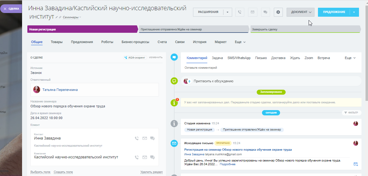 В воронке "Семинары" со стадиями Новая регистрация, Приглашение отправлено/Ждём на семинар, Пришел! и Не пришел =( вы можете организовать регистрация на любой семинар и проанализировать посещаемость мероприятия.