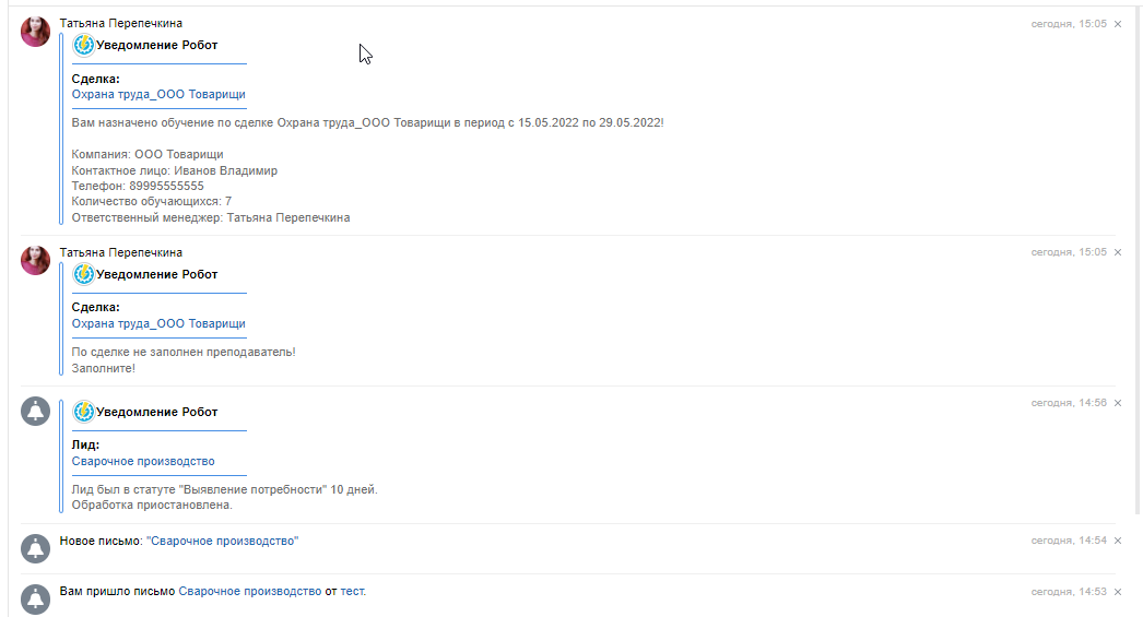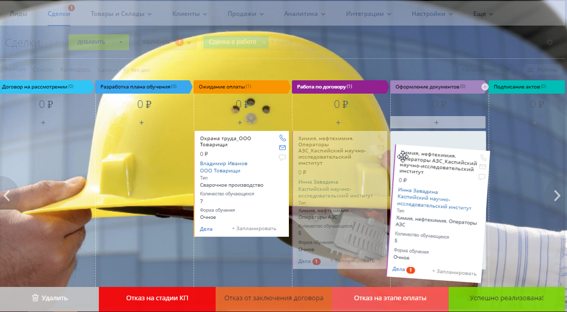 CRM для учебных центров подходит вам, если вы - компания, которая обучает сотрудников охране труда, безопасности и рабочим специальностям, проводит семинары и осуществляет оценку условий труда. CRM поможет составлять графики обучения, наблюдать за календарем преподавателей, формировать коммерческие предложения и договоры, напомнит о повторном обучении, пригласит на семинар и зафиксирует причины провала.