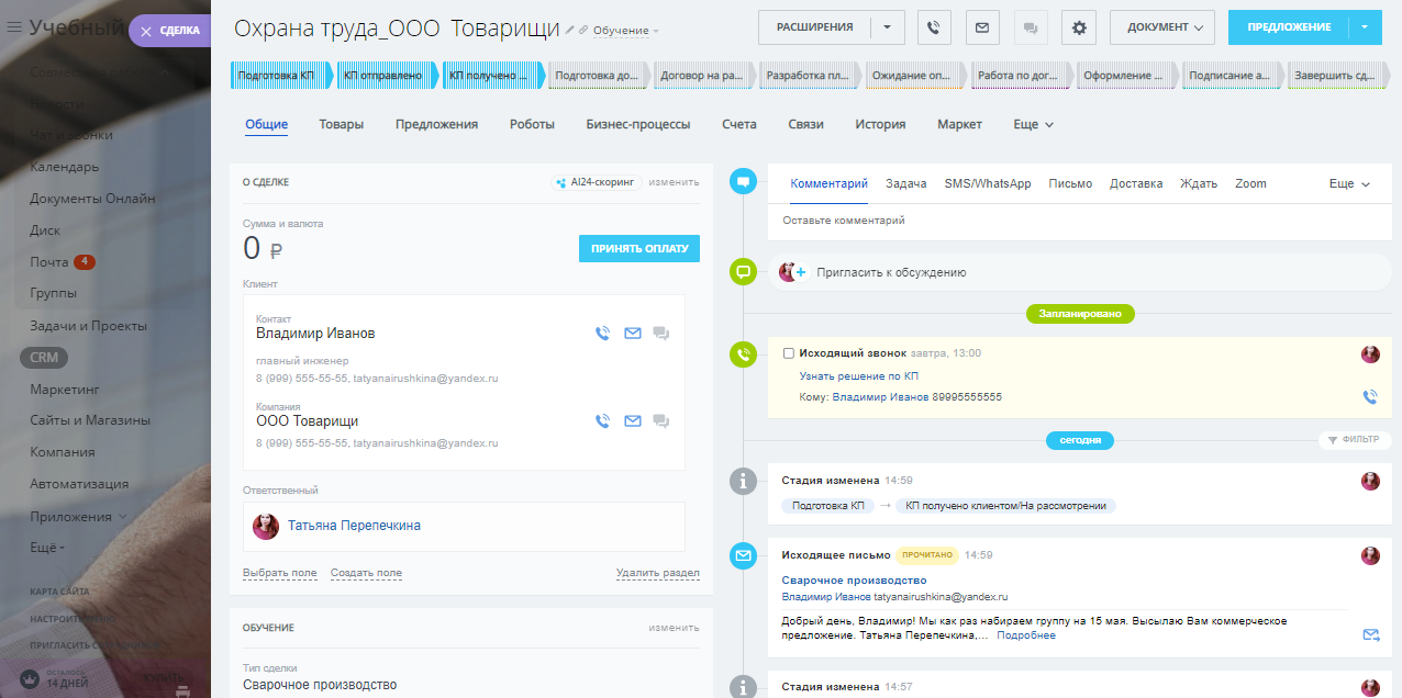 Для удобства работы уже настроен справочник направлений обучения Тип сделки (Охрана труда, Водители погрузчиков, Кадровое делопроизводство и т.п.) и добавлены дополнительные поля (Количество обучающихся, Преподаватели, Список рабочих профессий, Даты начала и окончания обучения, Форма обучения и другие необходимые поля).