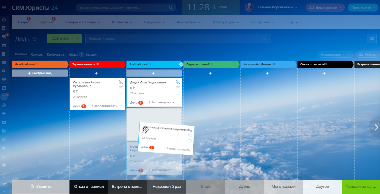 Готовое решение для юридических компаний подходит тем, кто готовит пакеты документов, совершает выезды и представляет интересы клиентов в суде, а также стремится качественно работать с допродажами. С помощью нашего решения каждый сотрудник будет видеть свои дела и не сможет о них забыть, а руководители отделов смогут снимать нужные показатели в режиме реального времени. А для того, чтобы работать с большим количеством информации было удобнее, в решении настроены карточки лида, контакта и сделки, состоящие из разделов, объединяющих логически связанные поля.