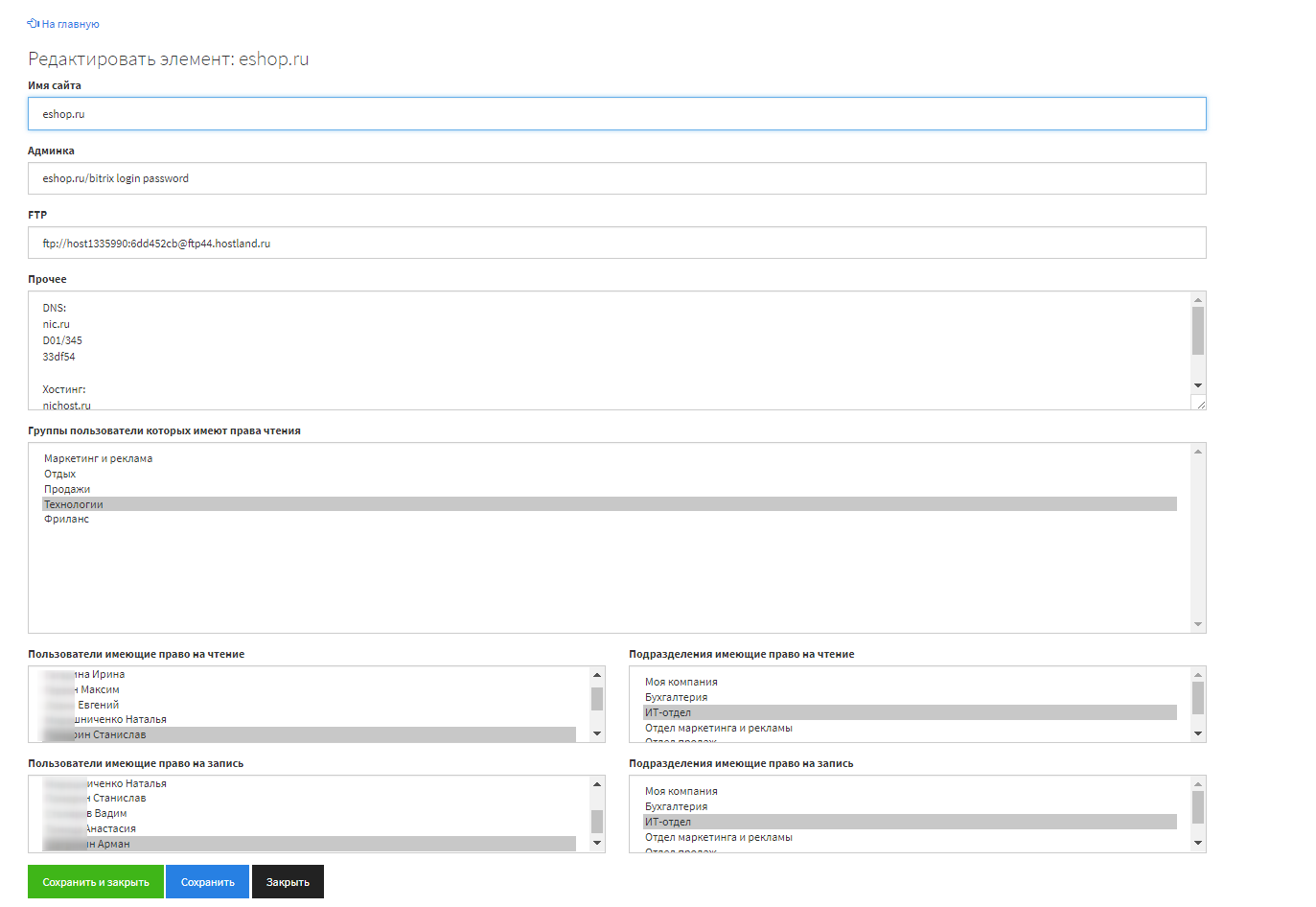 Администратор портала имеет полный доступ ко всем записям в ПАРОЛЬНИКЕ. Он может назначать права для всех записей.