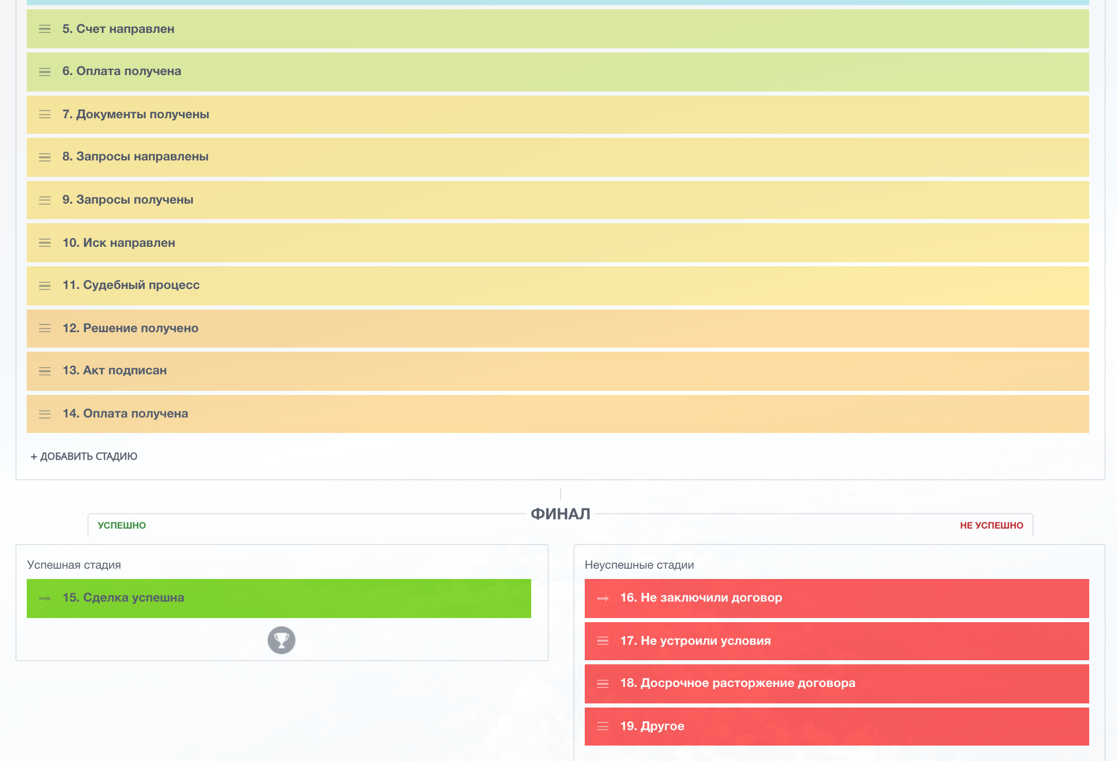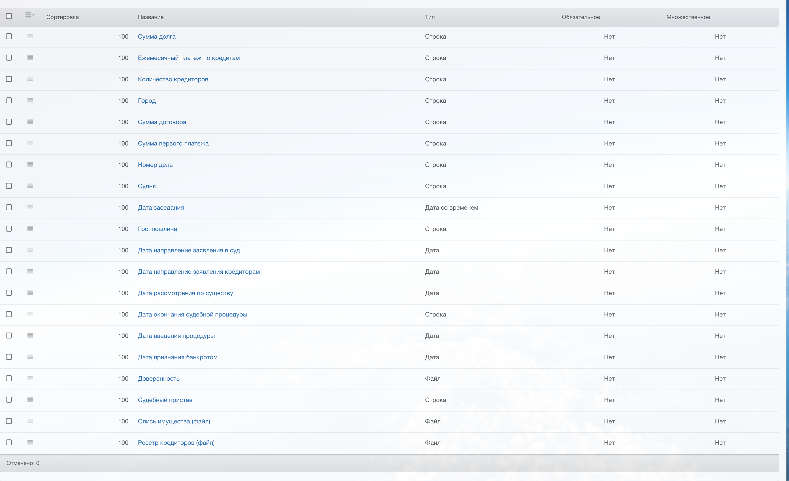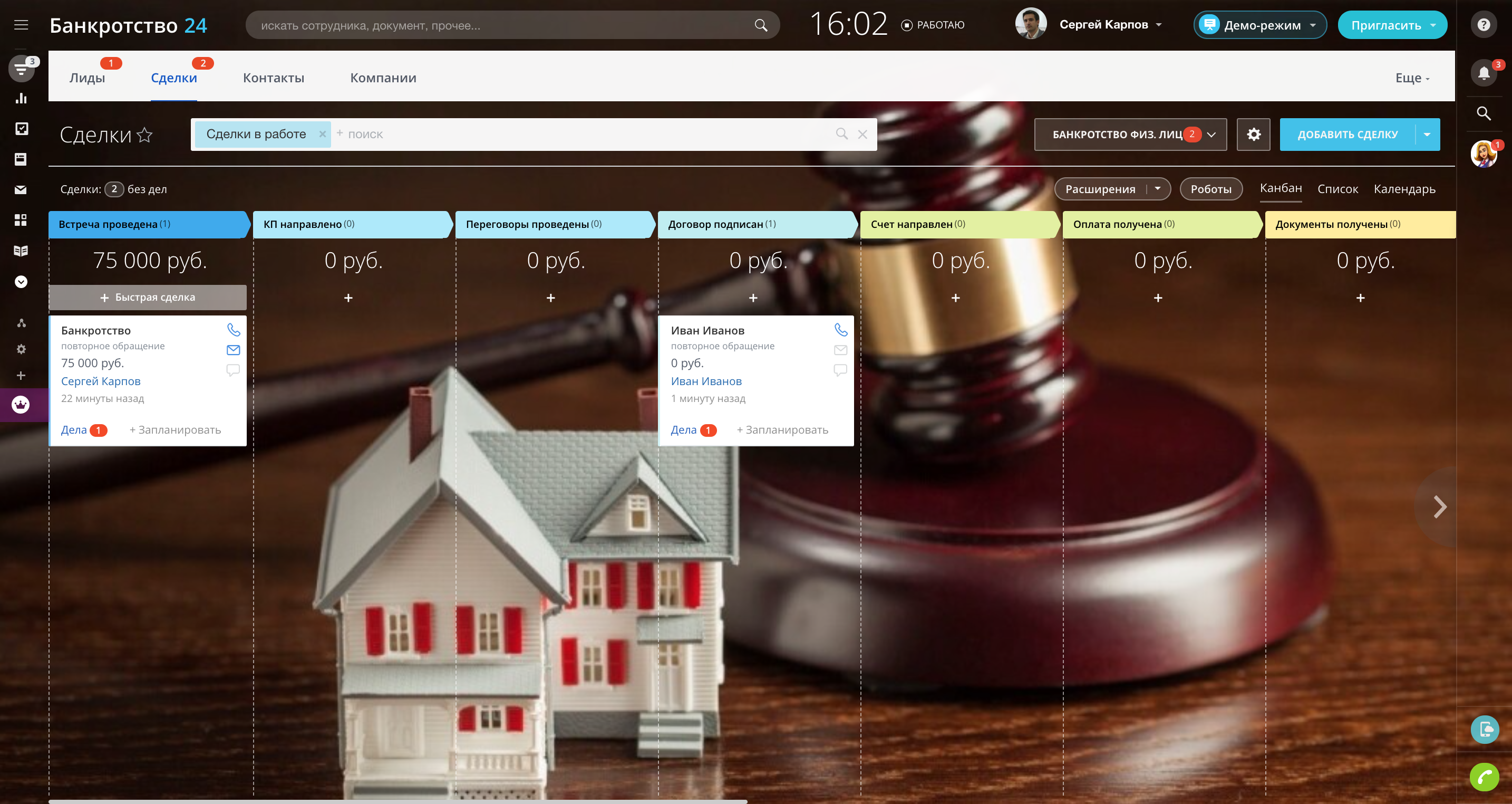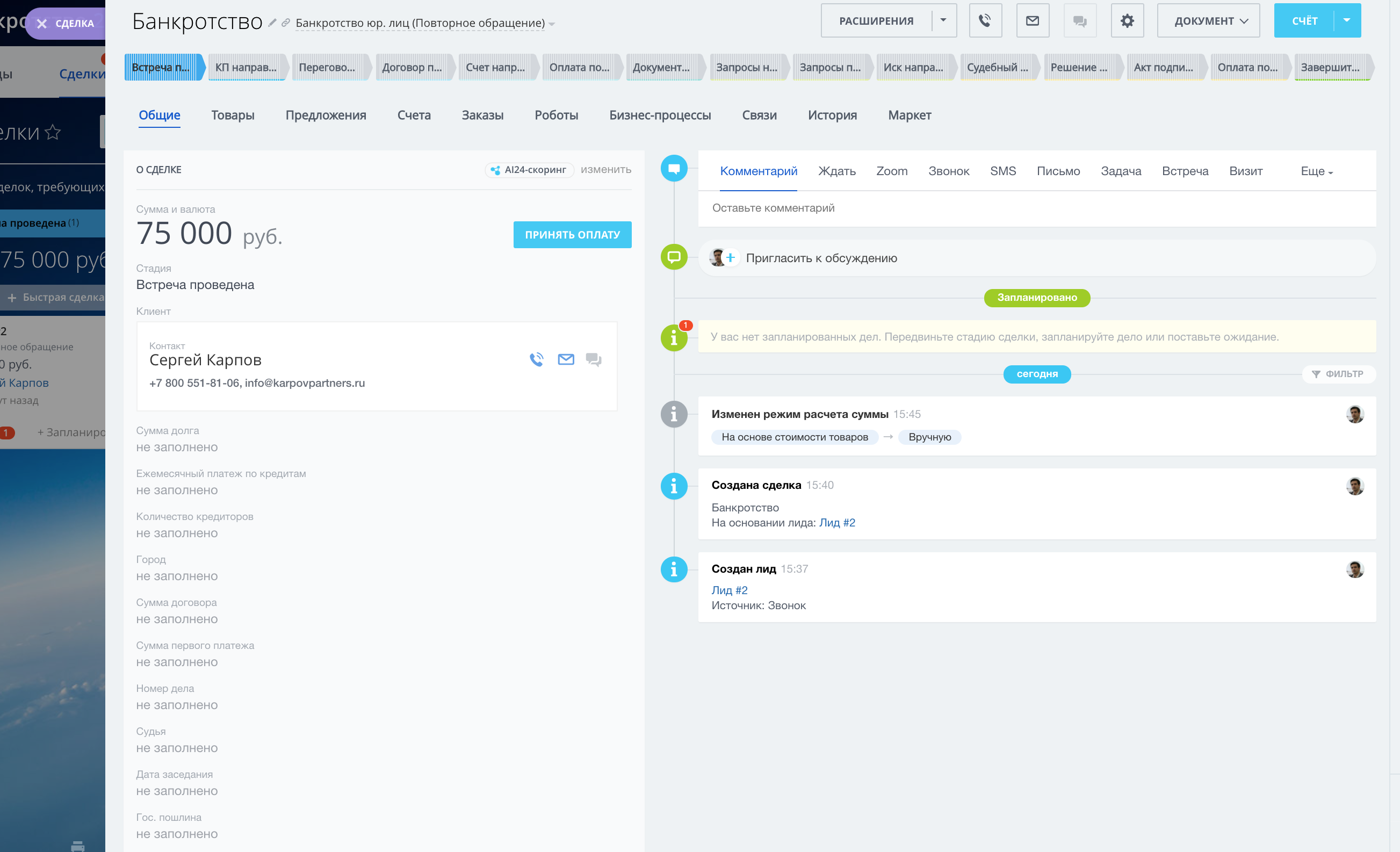 Отраслевое решение создано для юридических компаний специализирующихся на делах о банкротстве физических и юридических лиц с автоматизацией сценариев обработки первичных обращений в разделе лиды и сценариев работы по сделкам «Банкротство Физ. лиц» и «Банкротство Юр. лиц» с автоматической постановкой роботов задач на каждом этапе процесса Банкротства.