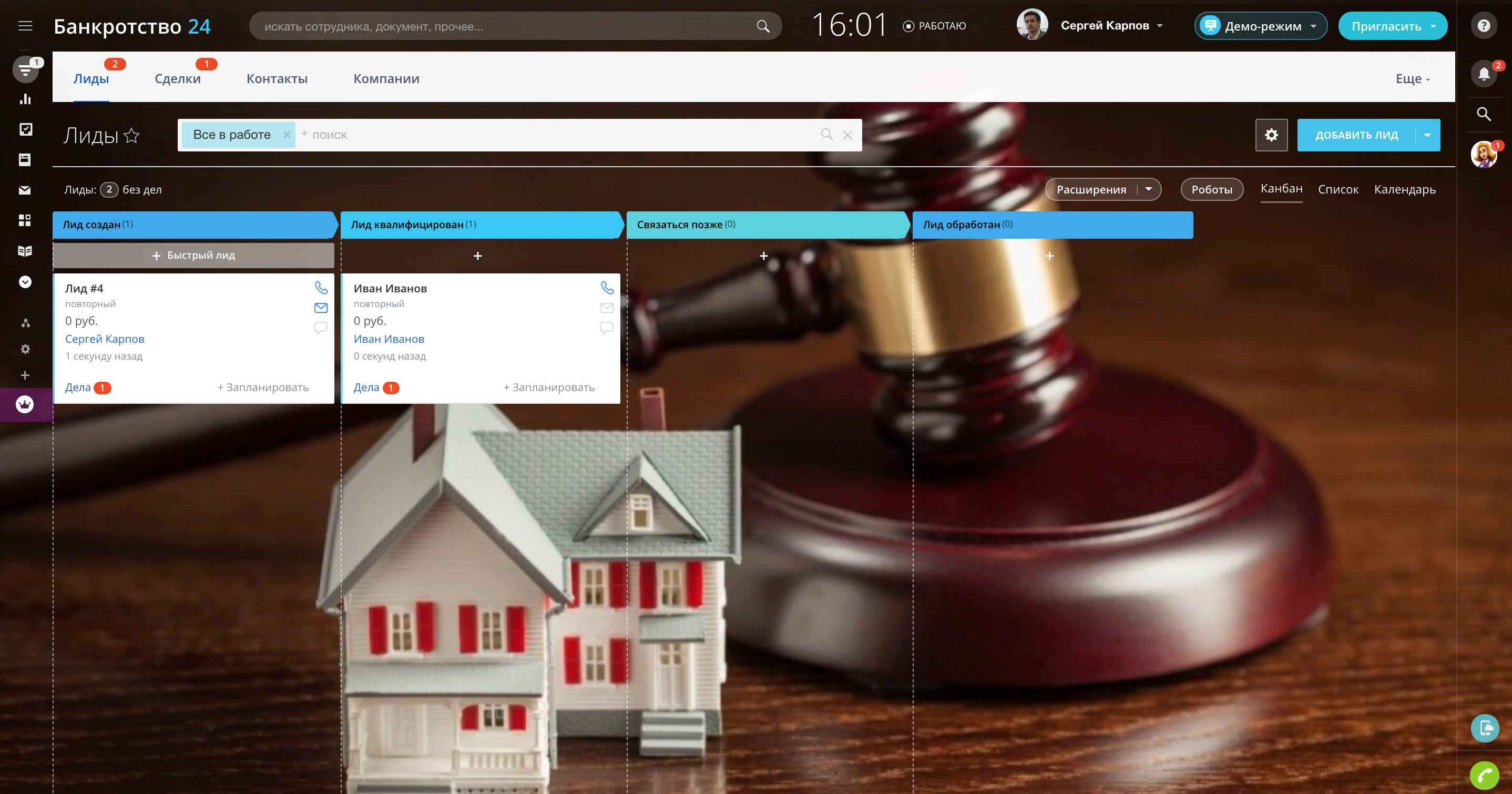 Отраслевое решение создано для юридических компаний, специализирующихся на делах о банкротстве физических и юридических лиц с автоматизацией сценариев «Обработки первичных обращений» в разделе «Лиды» и сценариев работы по сделкам «Банкротство Физ. лиц» и «Банкротство Юр. лиц» с автоматической постановкой роботов задач на каждом этапе процесса Банкротства.