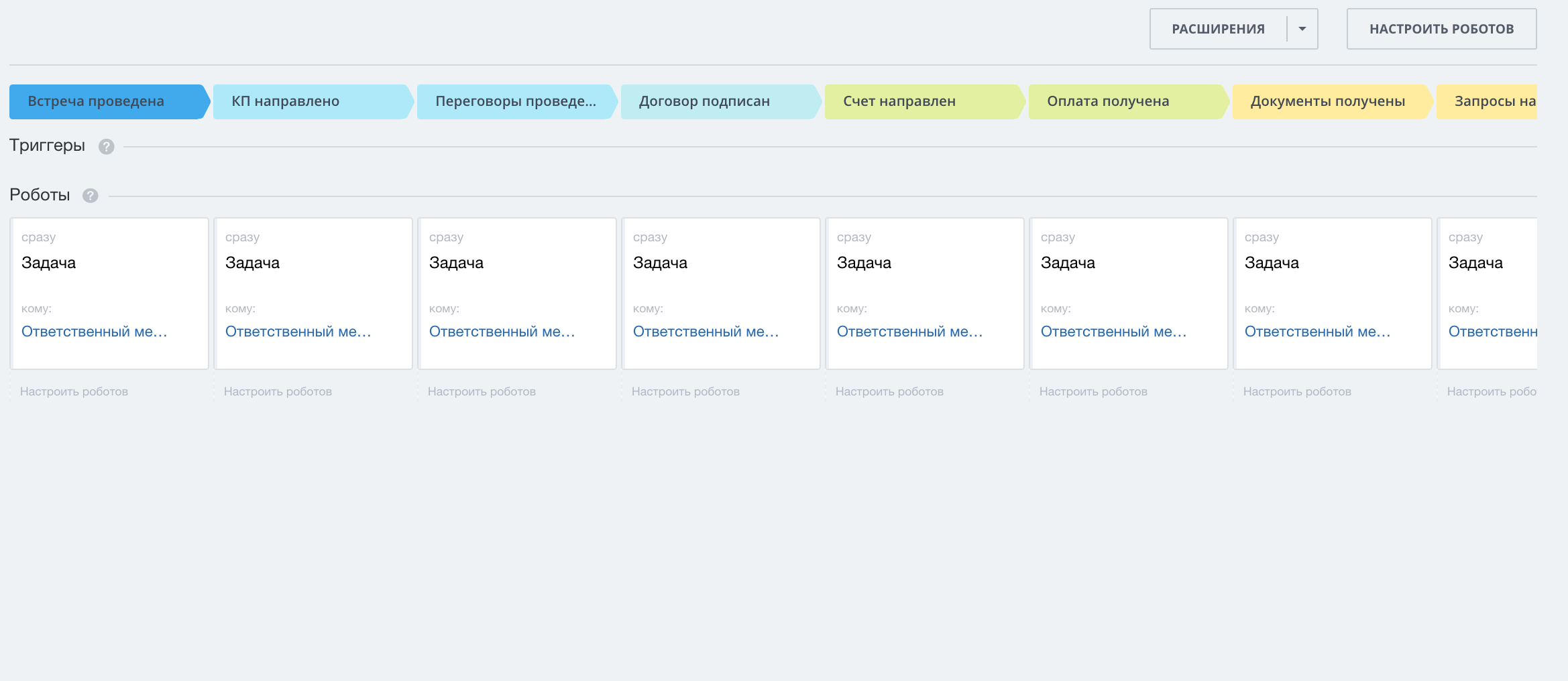Направление Сделки «Банкротство Юр. лиц» решает задачу визуализации всех сделок в работе с автоматической постановкой роботов задач на каждом этапе процесса сделки.