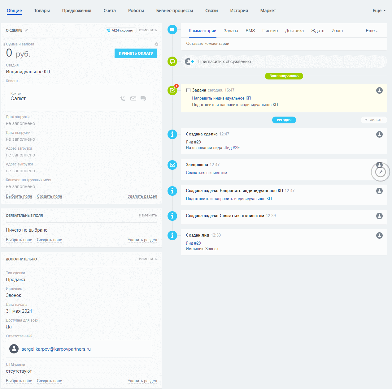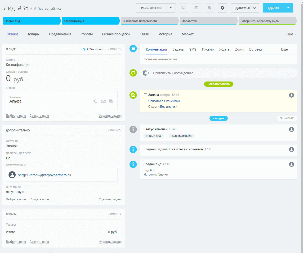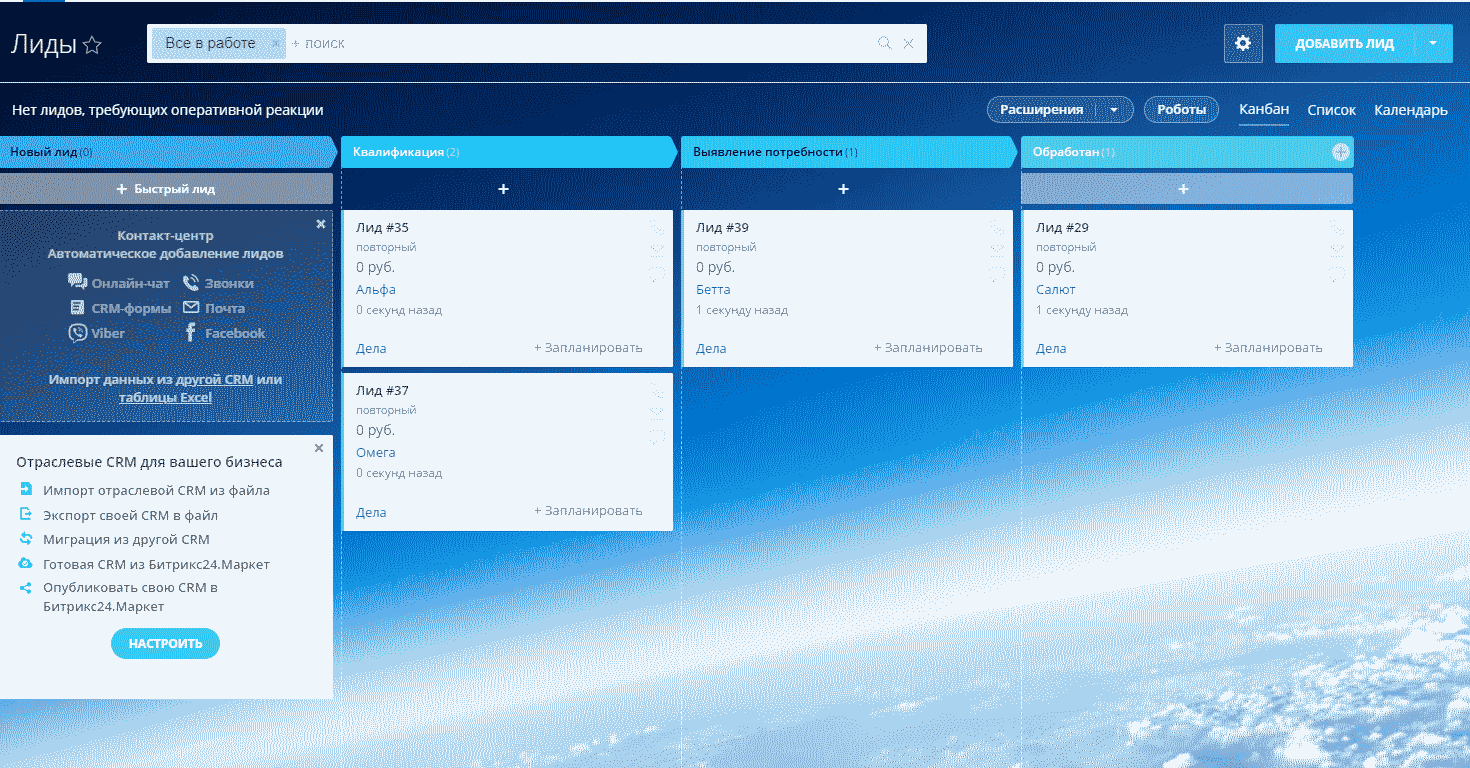 Раздел "Лиды" решает задачу обработки всех входящих звонков, почтовых сообщений и сообщений мессенджеров до этапа заключения договора с автоматической постановкой задач на каждом этапе обработки лида и контролем их выполнения.