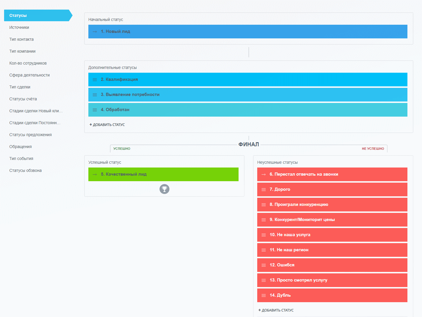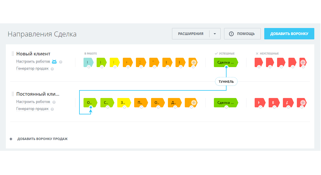 - 2 направления сделок: «Новый клиент» и «Постоянный клиент».