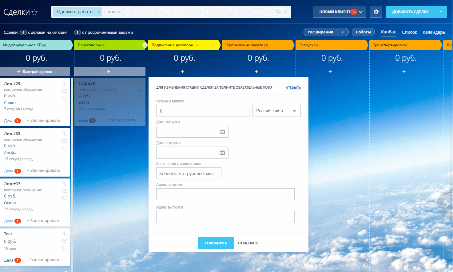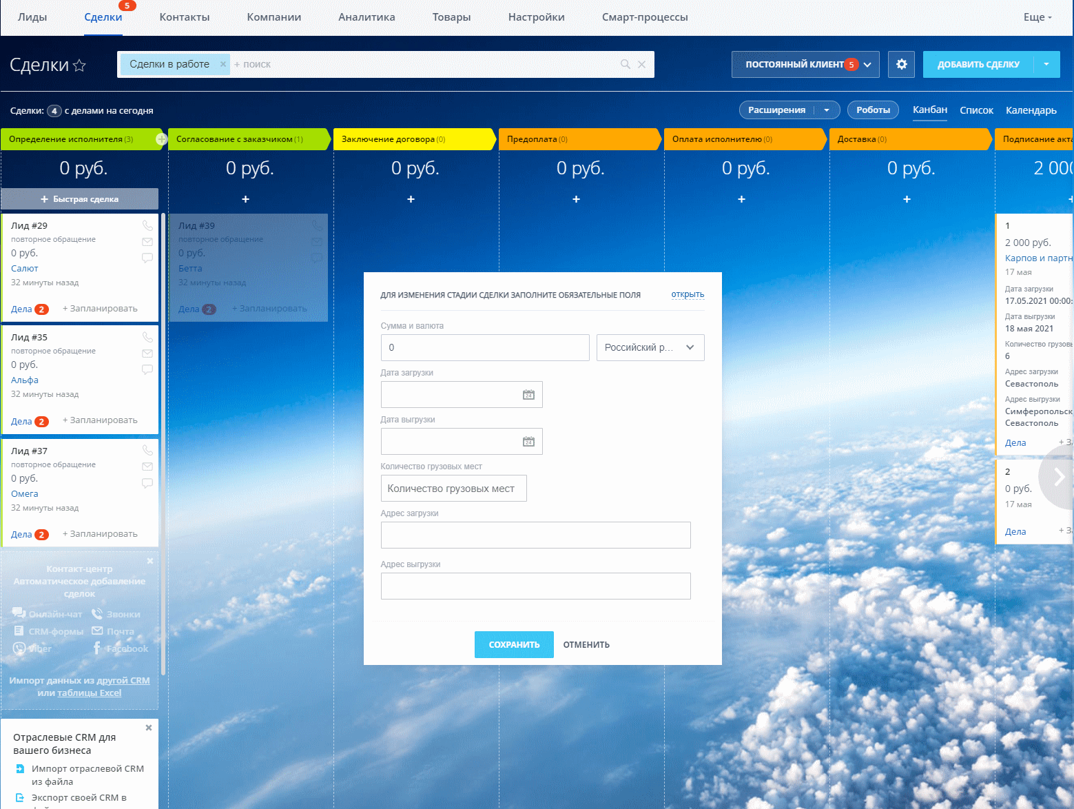 Отраслевое решение создано для транспортных компаний и частных перевозчиков с автоматизацией сценариев «Обработки первичных обращений в разделе «Лиды» и сценариев работы по сделкам «Новый клиент» и «Постоянный клиент» с автоматической постановкой задач на каждом этапе.