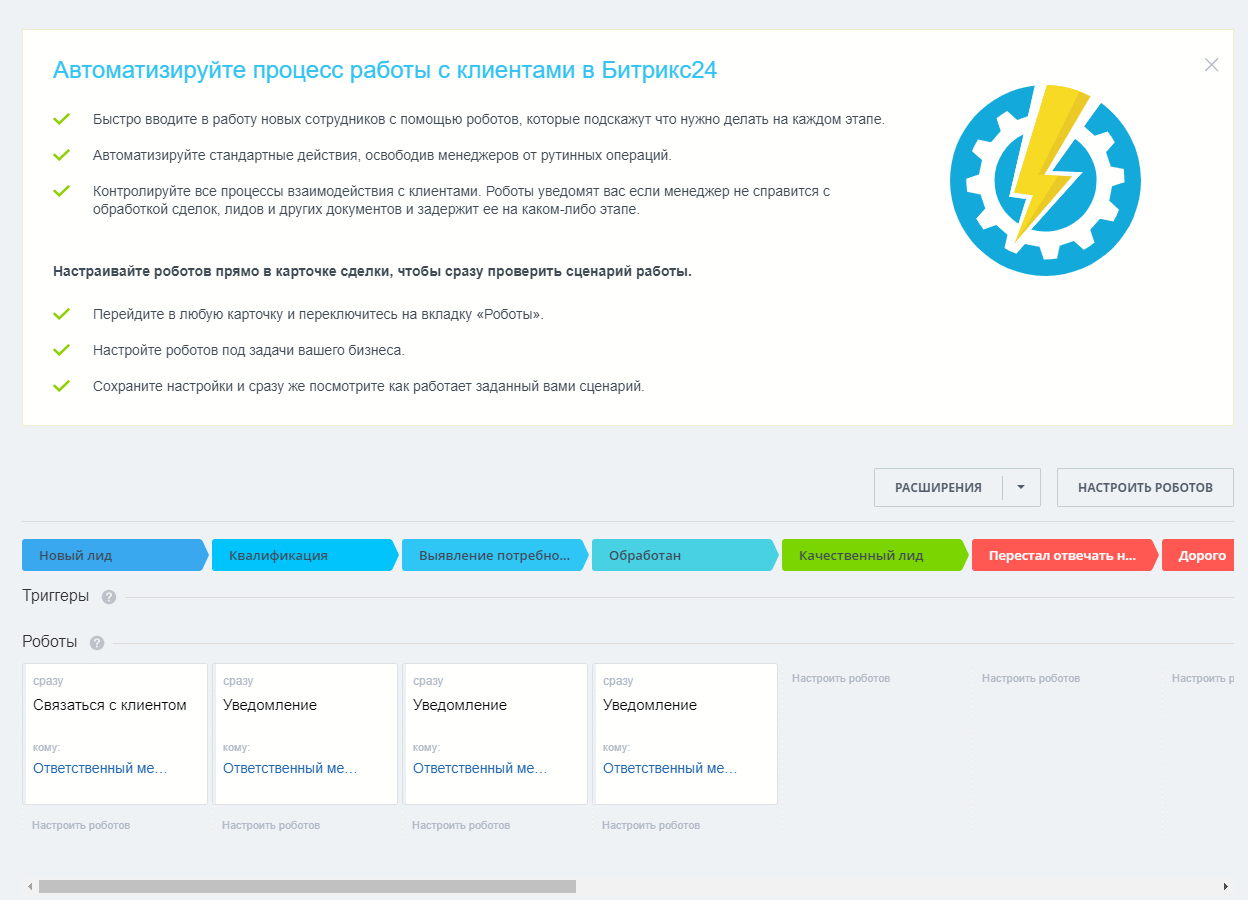 Направление сделки «Постоянный клиент» решает задачу визуализации всех сделок в работе с автоматической постановкой задач по каждой стадии.
