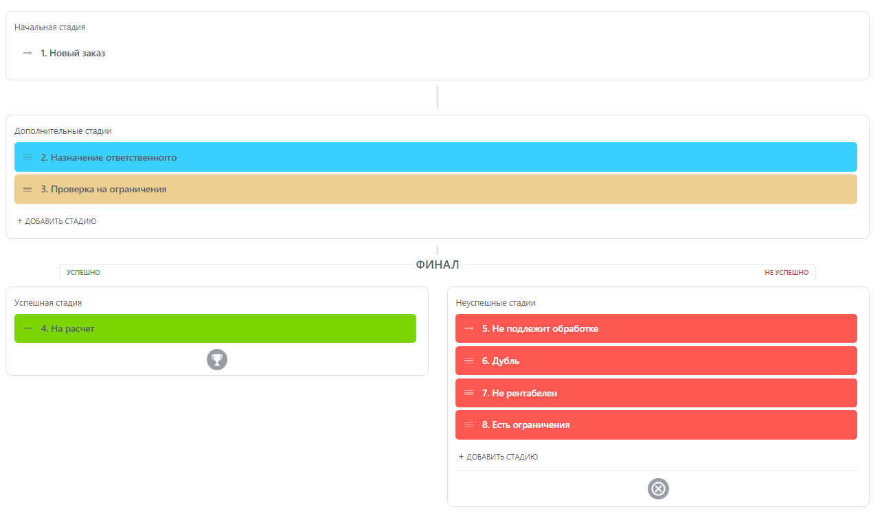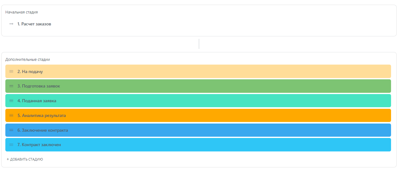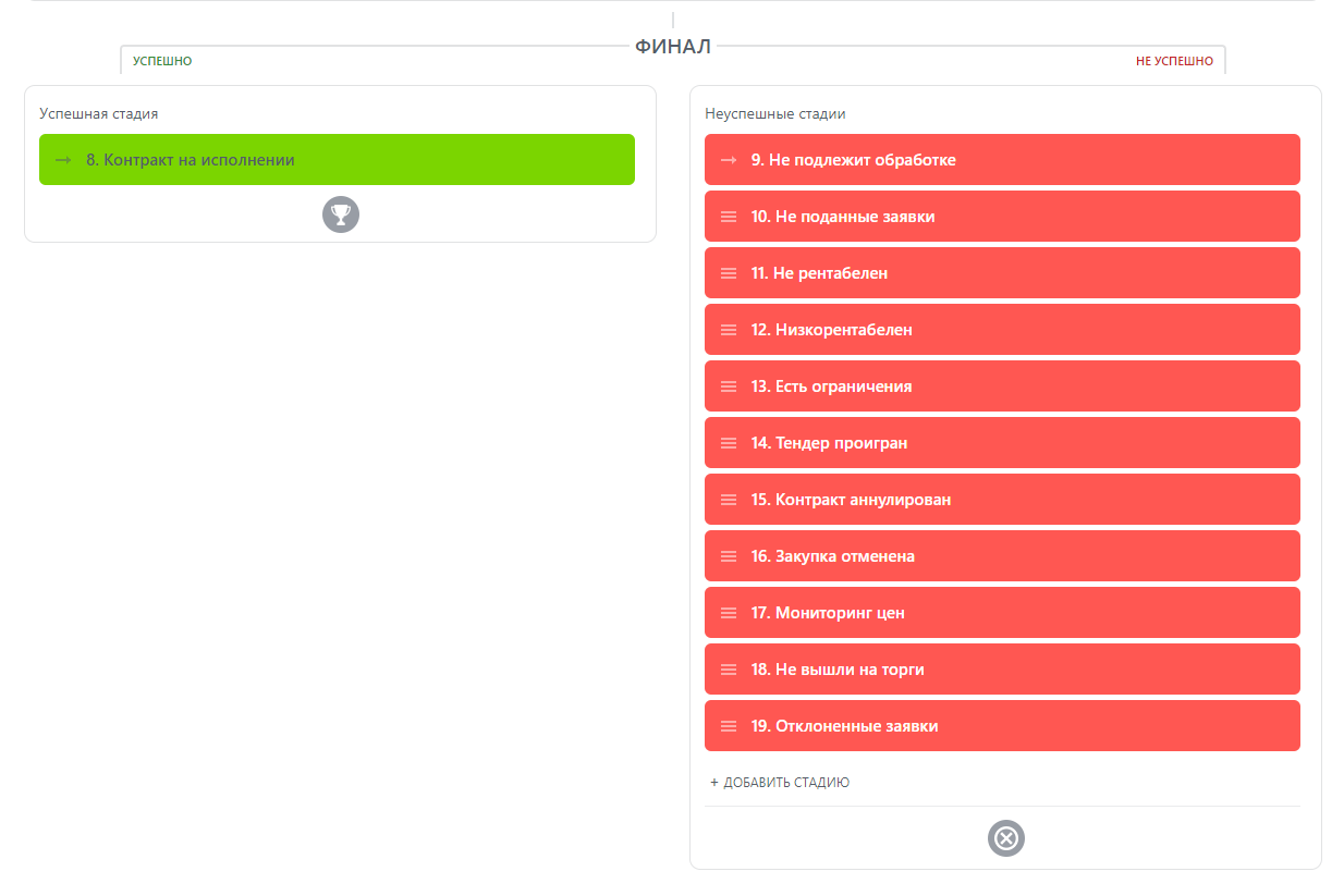 расчет заказов, на подачу, подготовка заявок, поданная заявка, аналитика результата, заключение контракта, контракт на исполнении; также широкий перечень негативных этапов.
