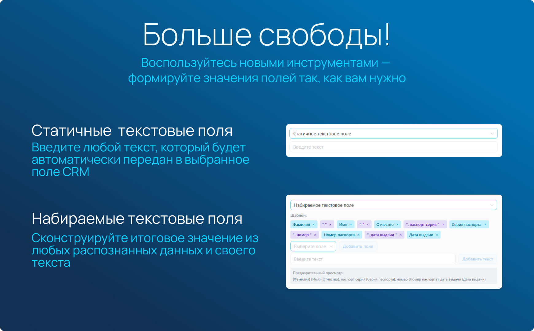 - Создавать статичные текстовые поля в CRM вместе с распознанными полями