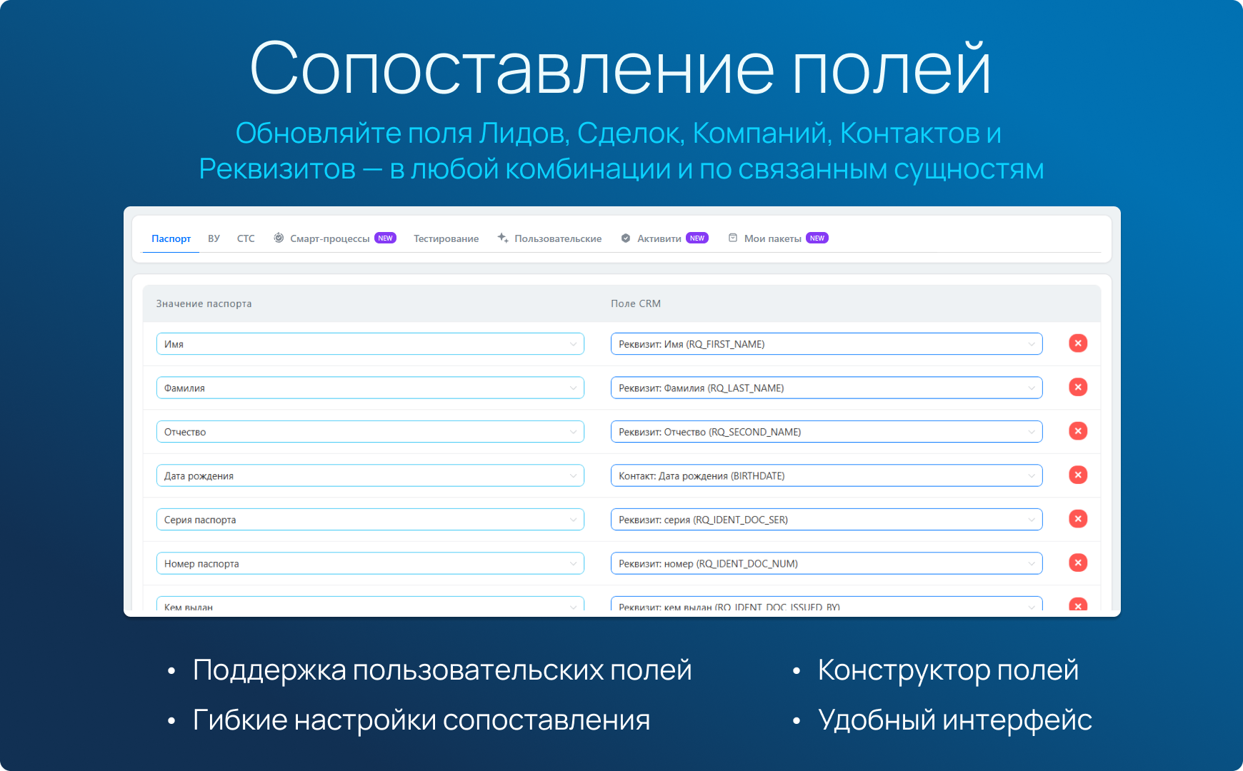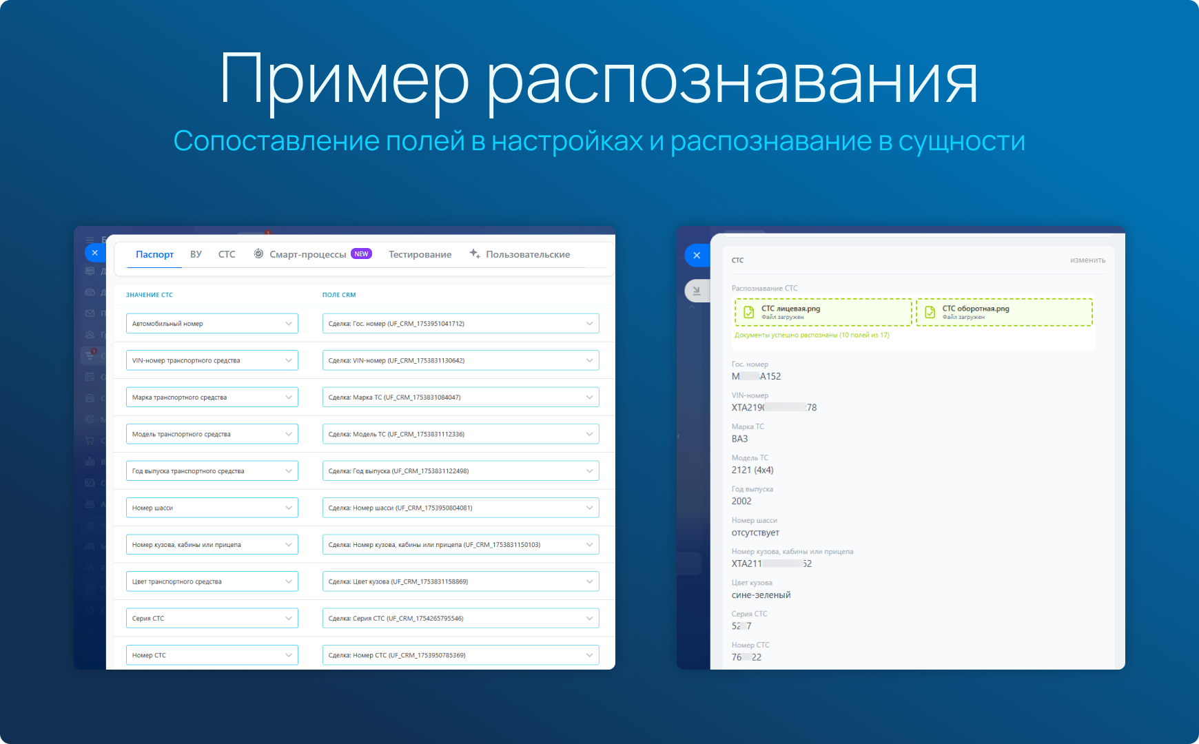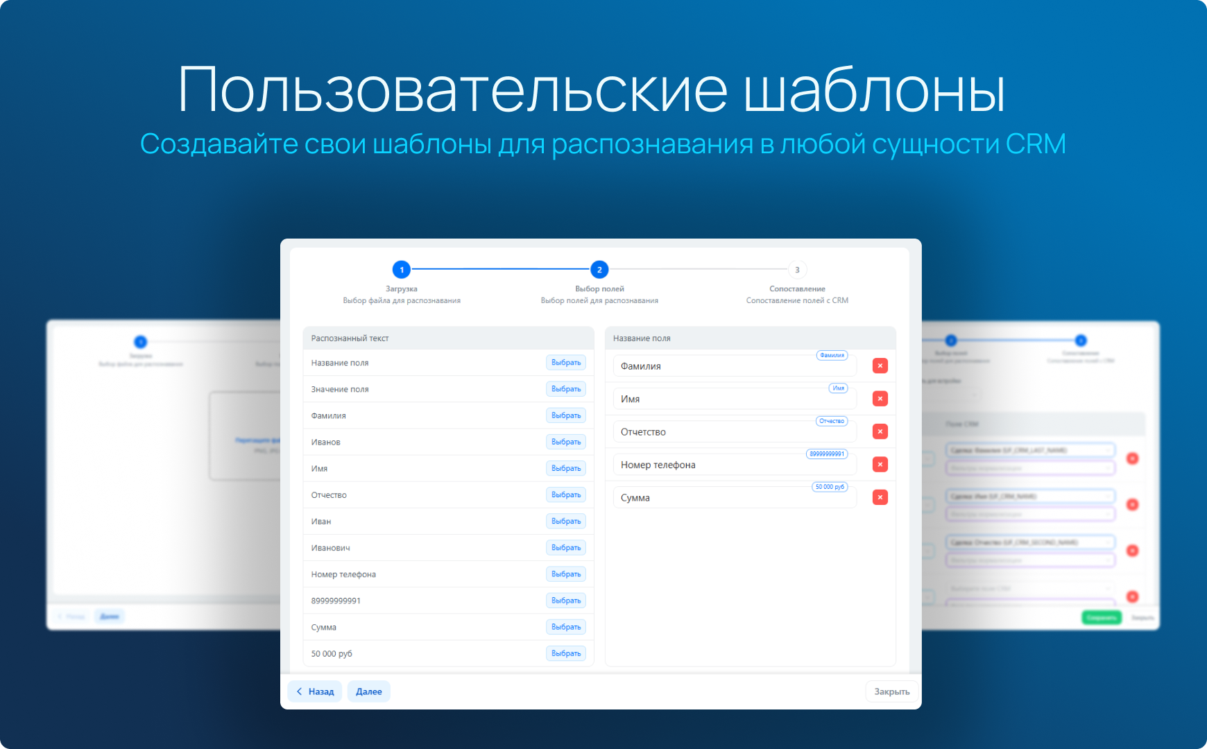 - Создание собственных шаблонов распознавания и добавление полей и вкладок для распознавания в карточки сущностей CRM.