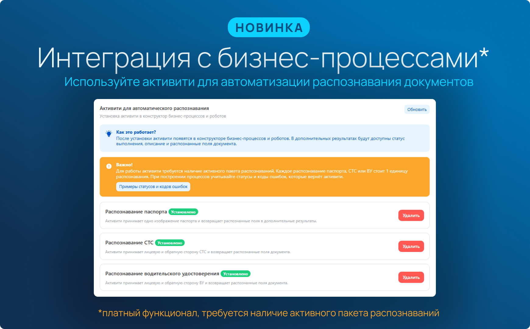 - Автоматическое распознавание в бизнес-процессах и роботах через активити - Платный функционал