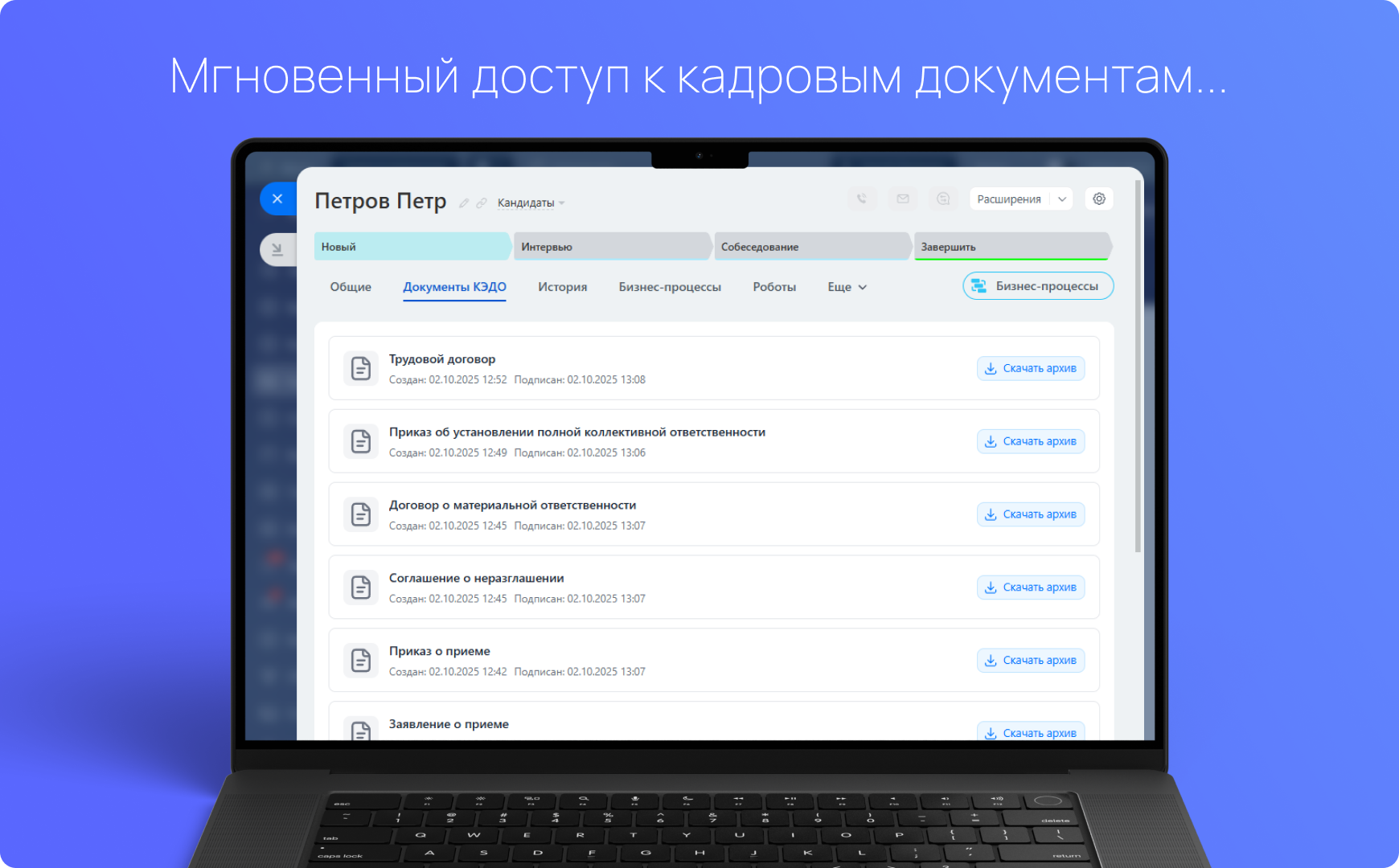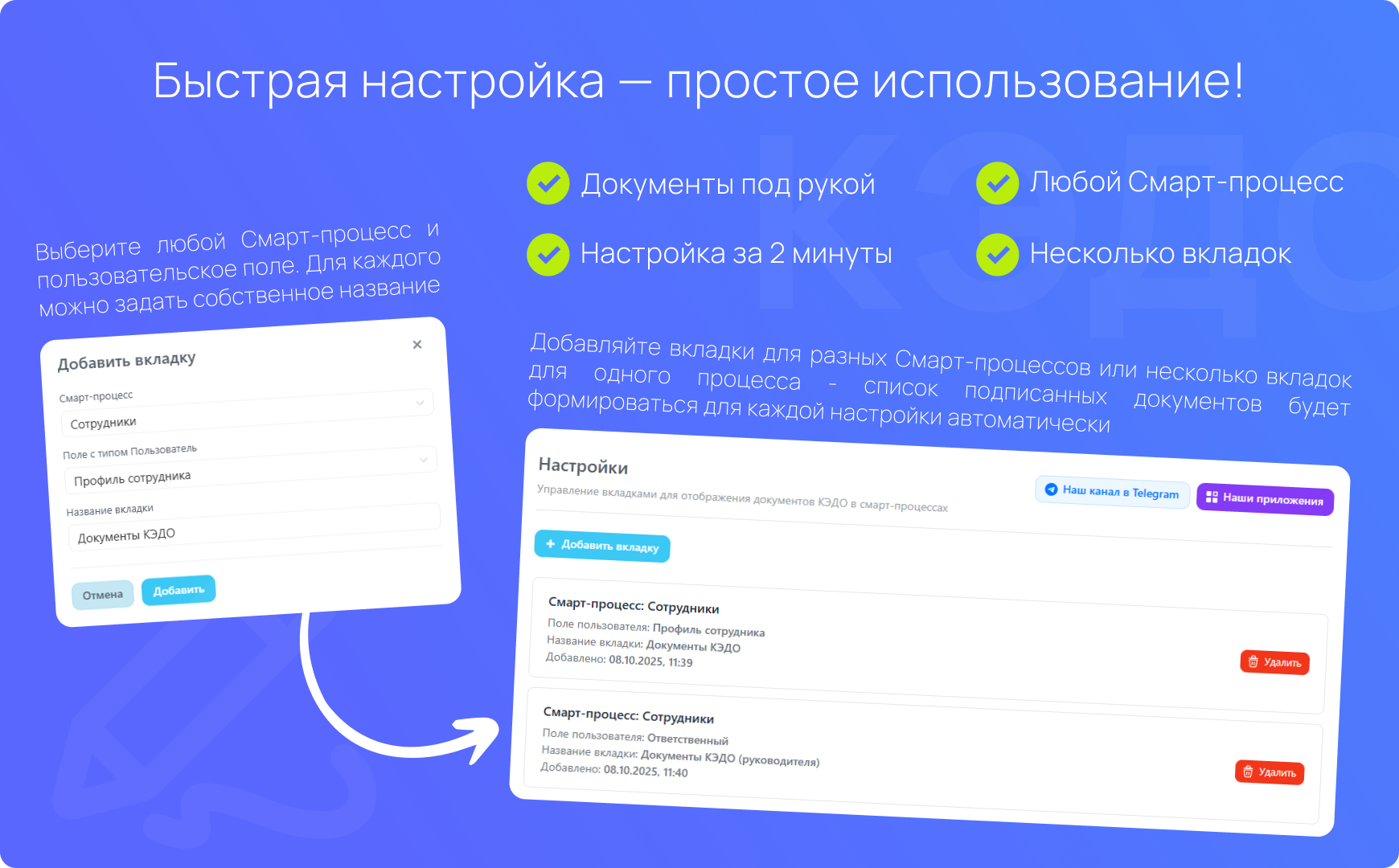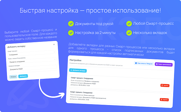 Приложение создаёт дополнительные вкладки в карточках Смарт-процессов и отображает в них документы из сейфа компании (КЭДО). Идеально подходит для автоматизации работы с кадровыми документами сотрудников в смарт-процессах HR.
