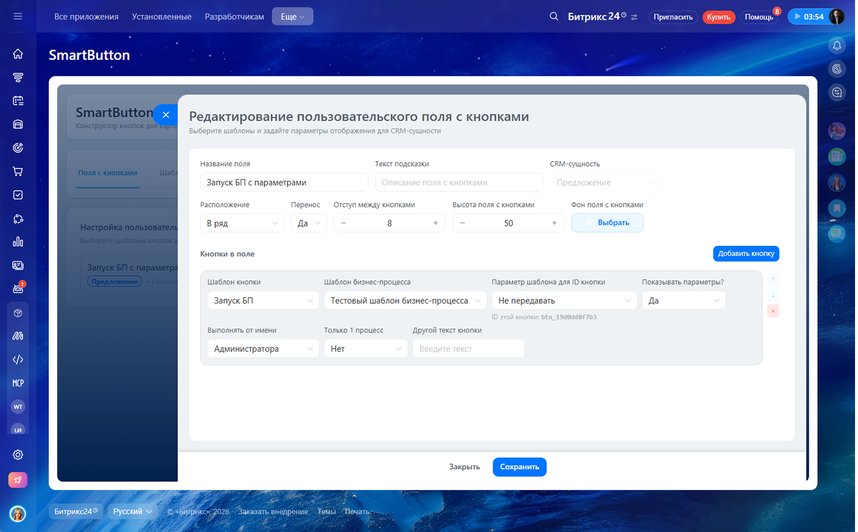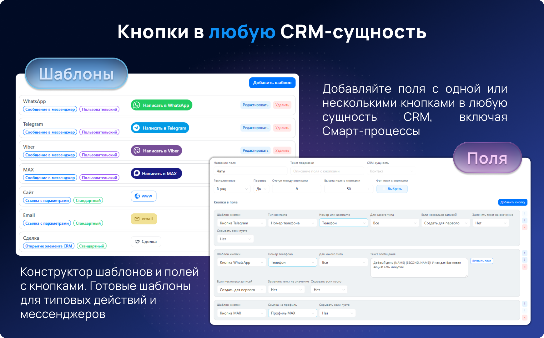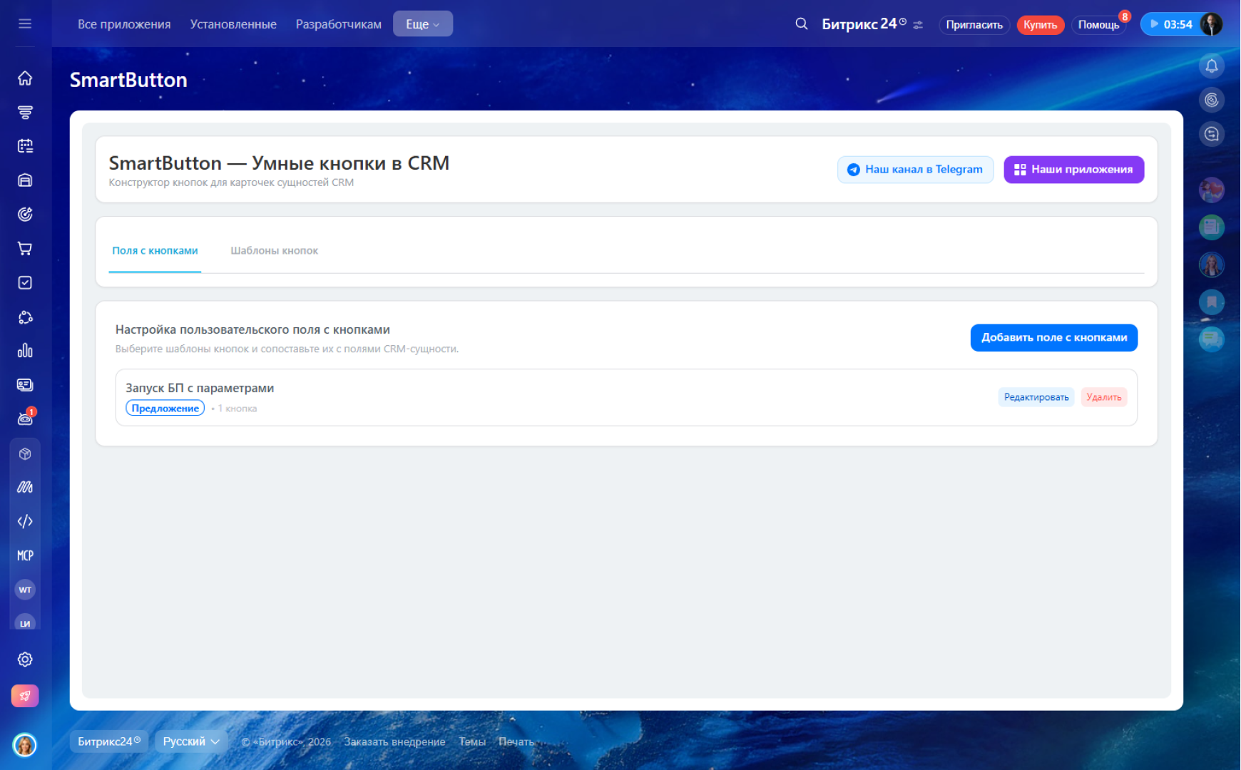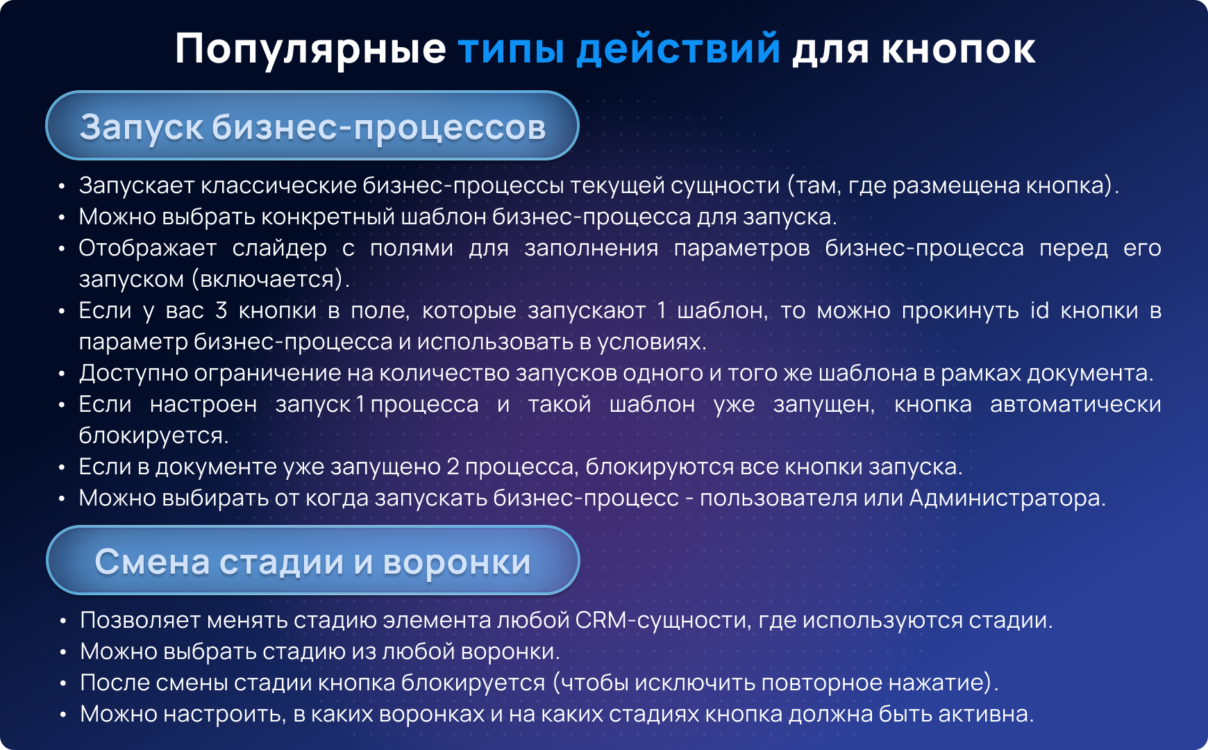 - Кнопки в CRM-карточках — добавляйте одну или несколько кнопок в любое поле, включая смарт-процессы.