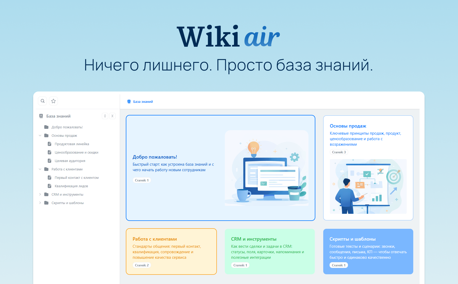 Устали от сложных настроек? WikiAir — это корпоративная «Вики», которая готова к работе сразу после установки. Храните регламенты, инструкции и заметки в удобном формате.