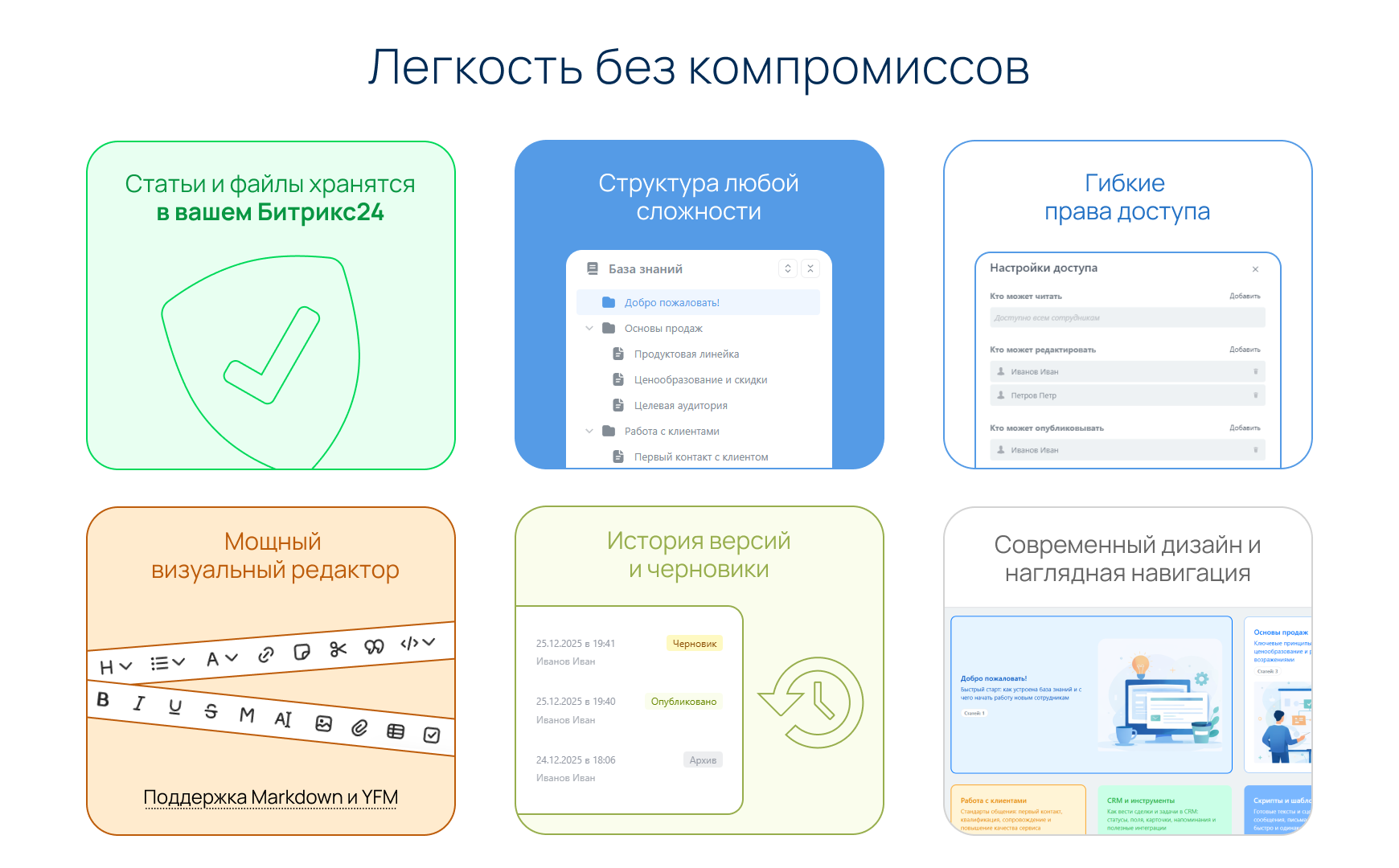- Гибкие права доступа: Закрывайте разделы для HR или Бухгалтерии, оставляя общие инструкции открытыми для всех.