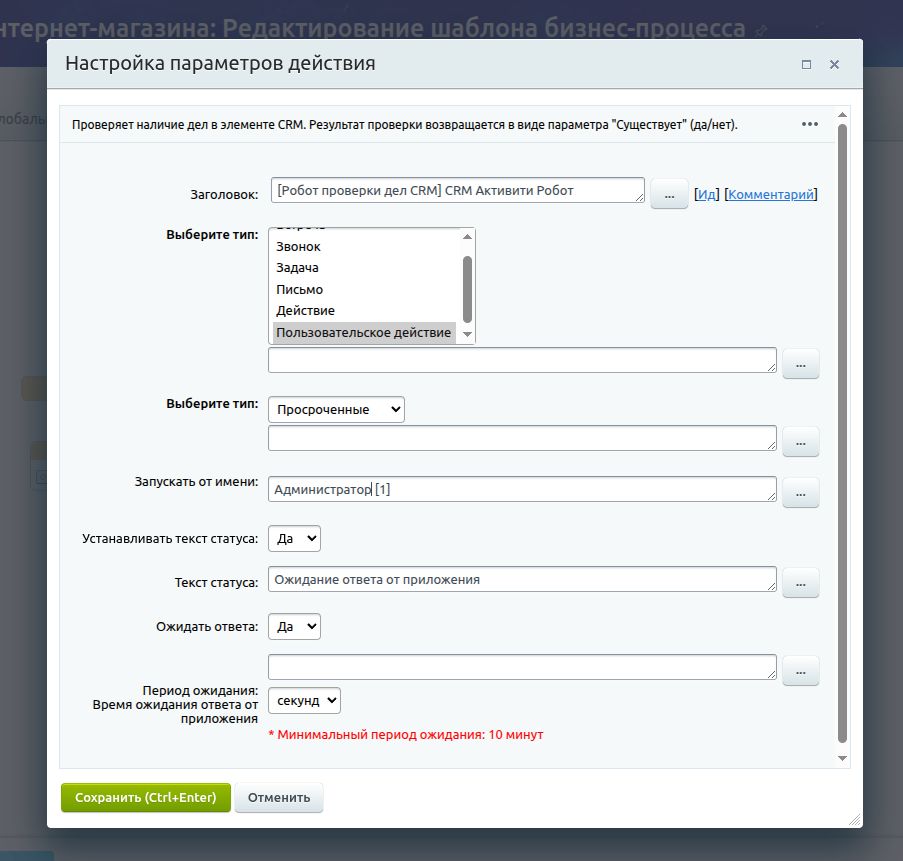 Приложение добавляет новое действие в дизайнер бизнес‑процессов. Наше приложение позволяет проверить, исходя из установленных фильтров, есть ли в сущности CRM (сделка, лид, контакт, компания и т. д.) дела. На основе этого можно построить цикл или условие.