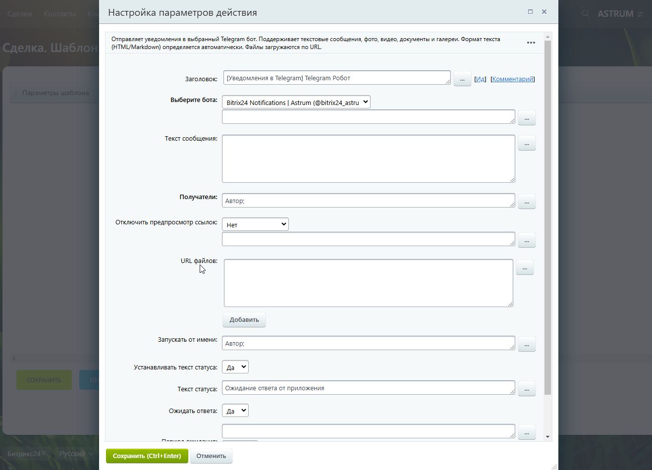 Добавляет роботов и активити для дизайнера бизнес-процессов, которые позволяют отправлять сообщения и уведомления сотрудникам портала в Telegram, а также — в произвольные чаты, группы, мульти чаты и темы в мульти чатов.