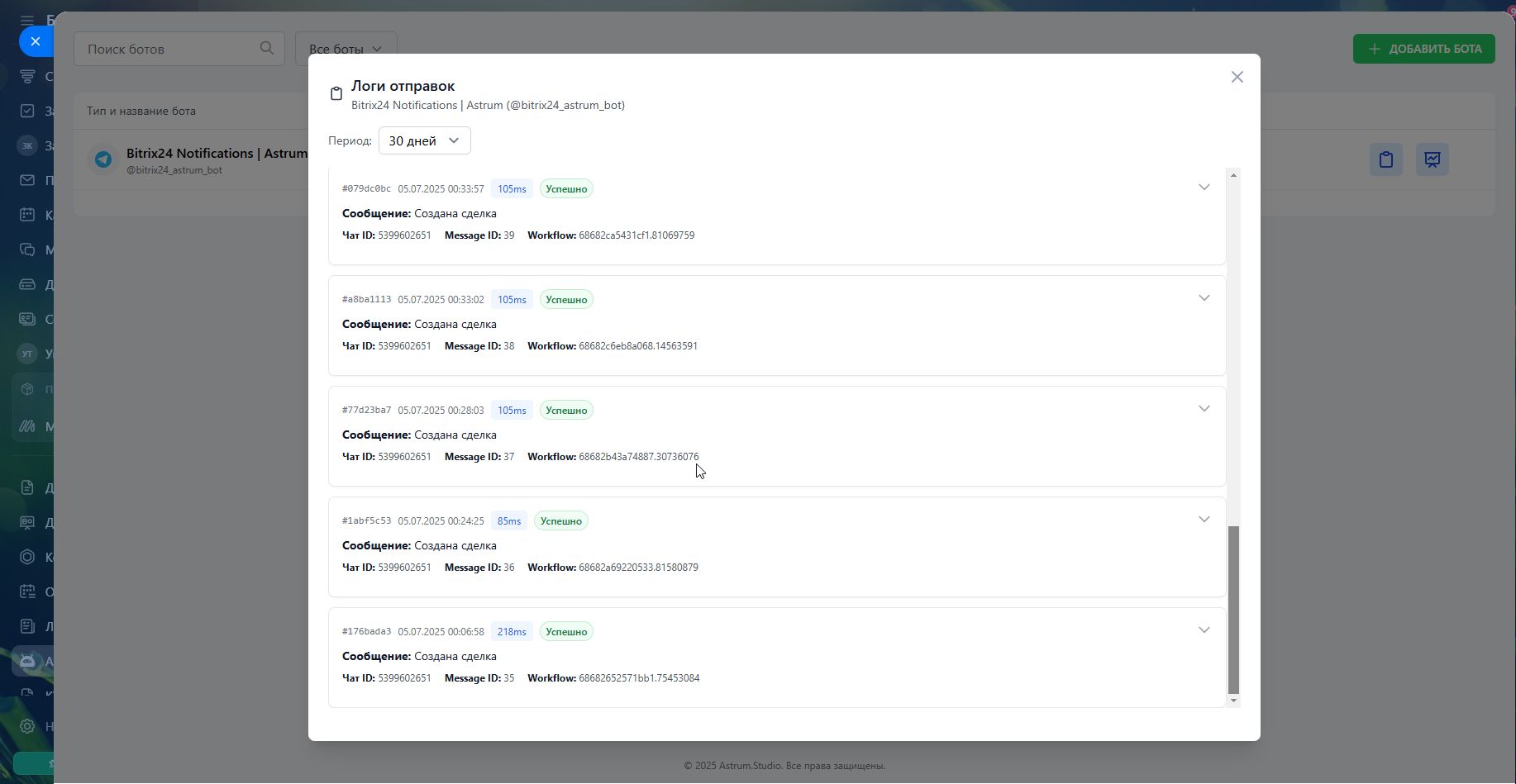 Дополнительно внутри приложения можно посмотреть статистику и логи отправки сообщений по каждому подключенному боту.