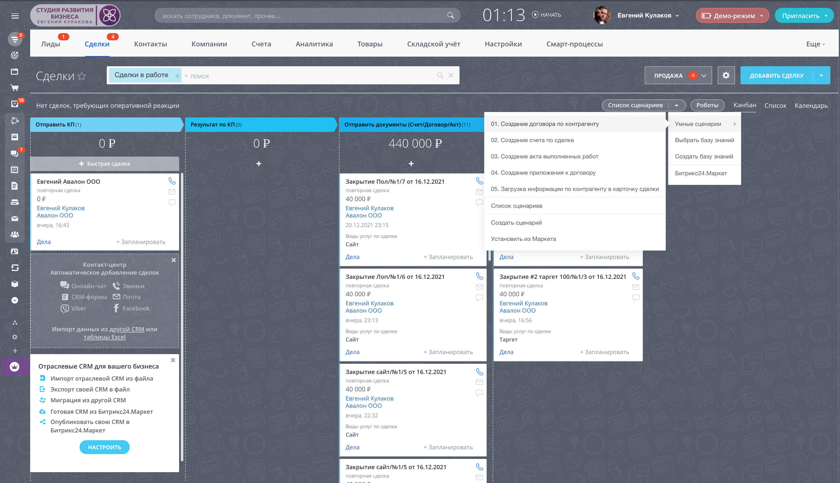 - Сценарии проверяют заполнение карточки компании и выводят информацию в карточку сделки (Карточка компании не заполнена, договор уже был создан и закреплен за контрагентом или создает документ)