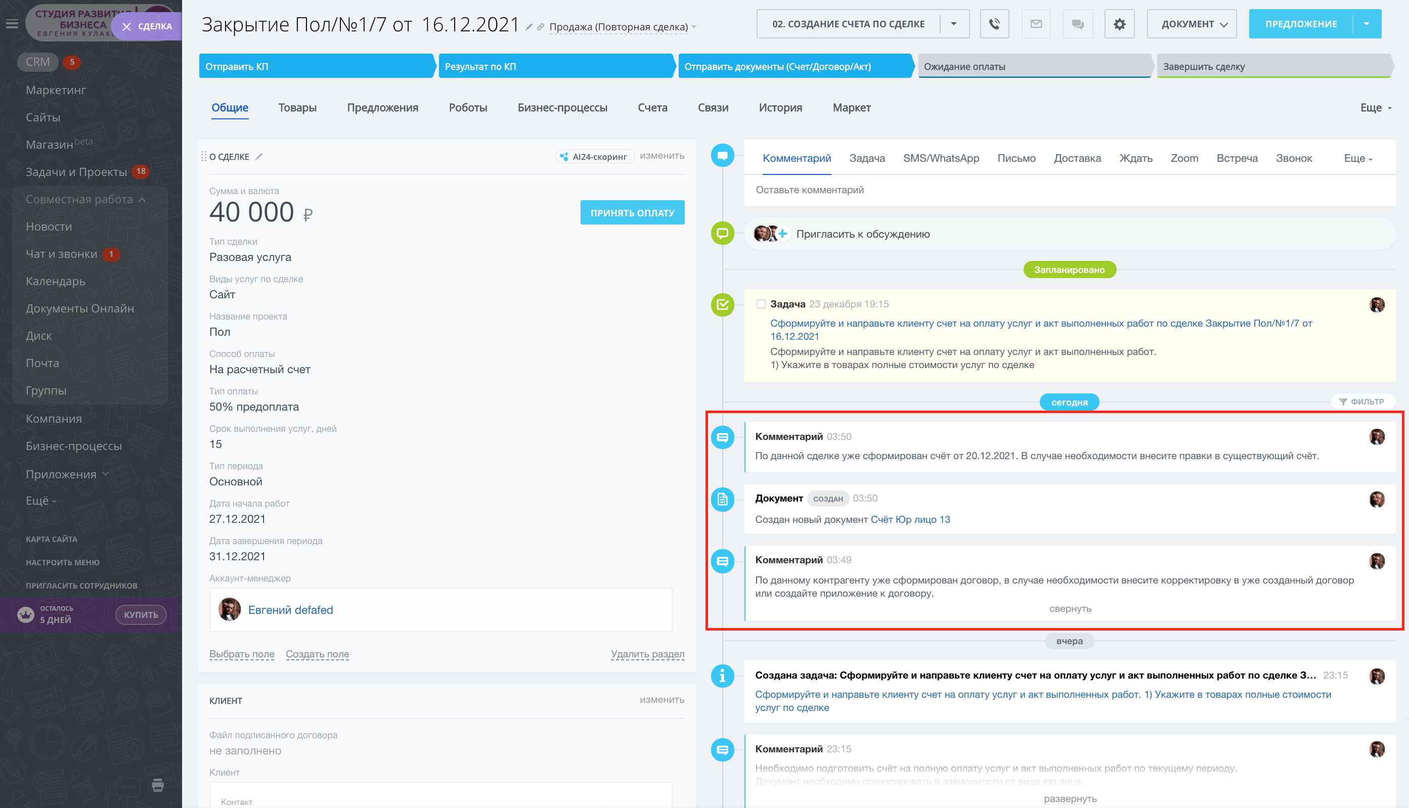 - Если счёт уже был создан система предложит внести изменения у уже созданный по сделке счёт