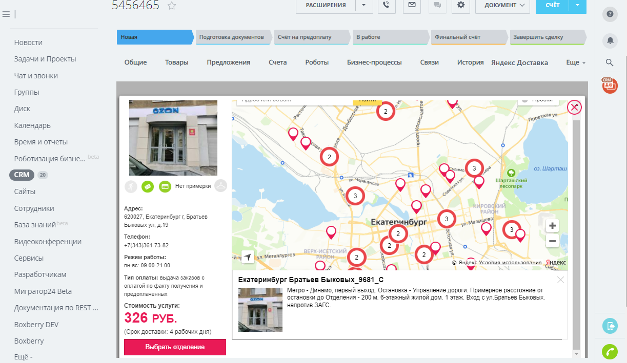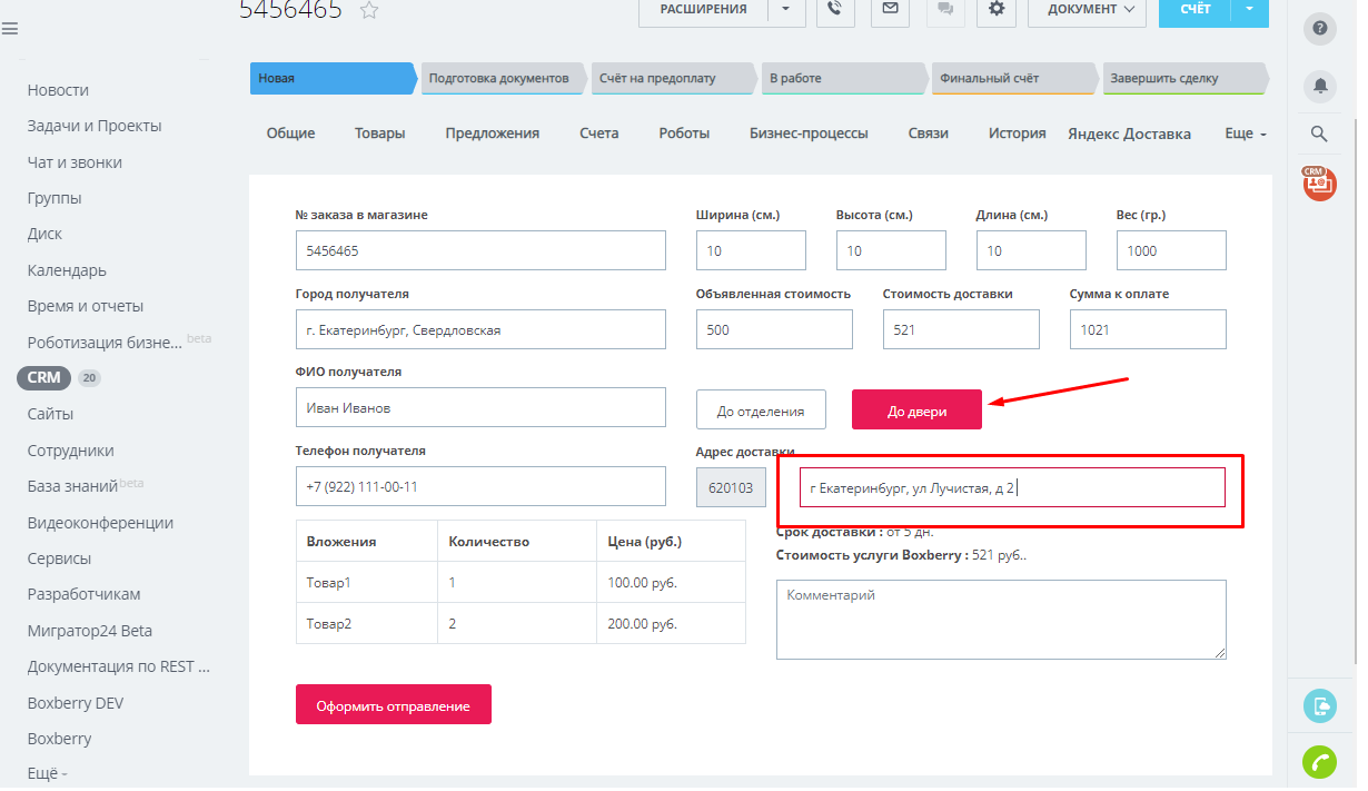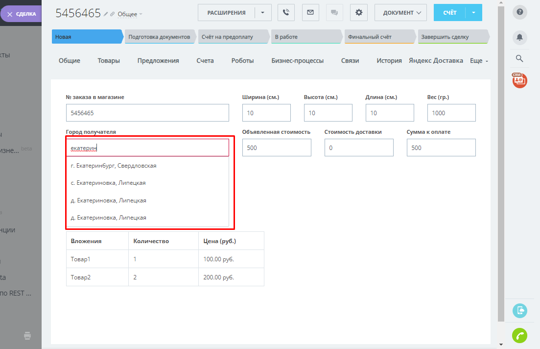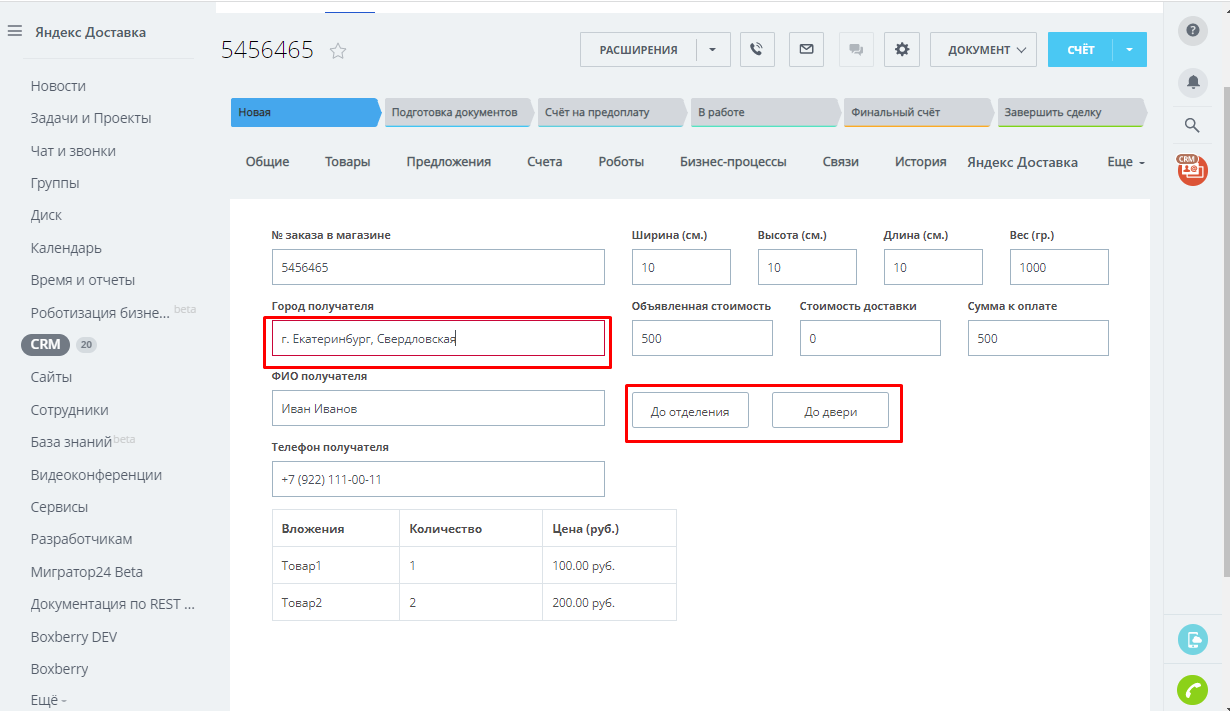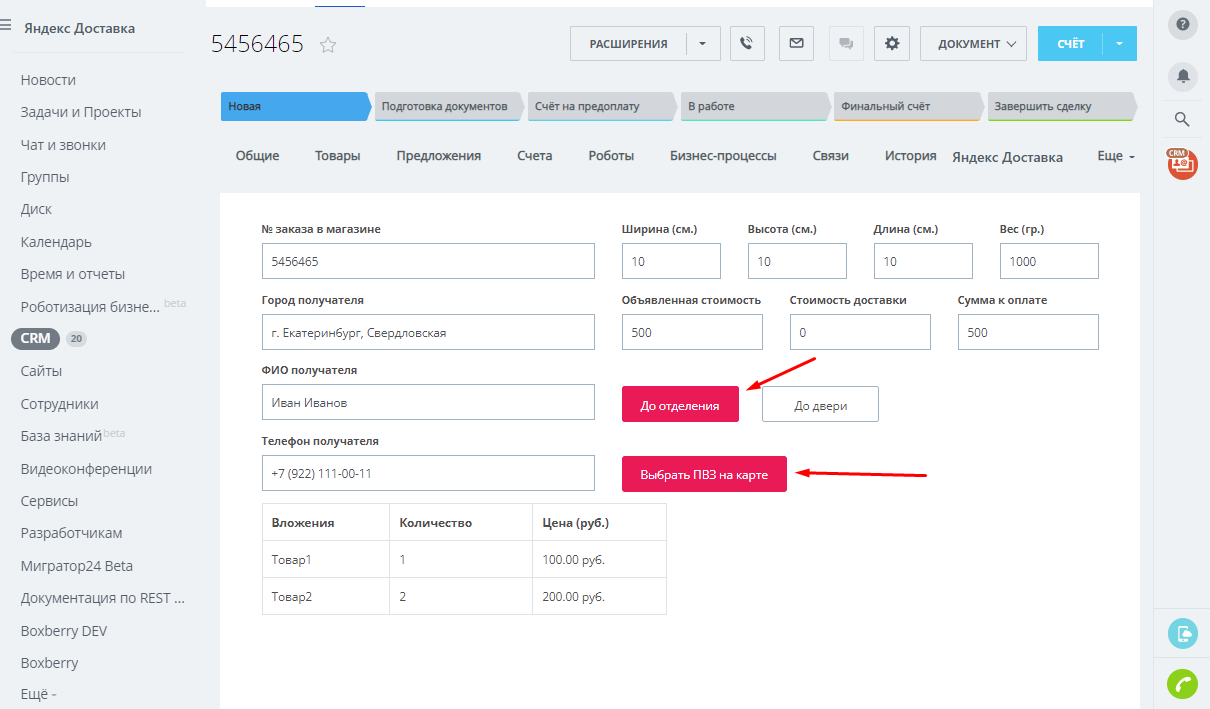 Приложение позволяет оформить доставку товара и отправку деловой корреспонденции через службу Яндекс Доставки из CRM Битрикс24 непосредственно со страницы сделки.