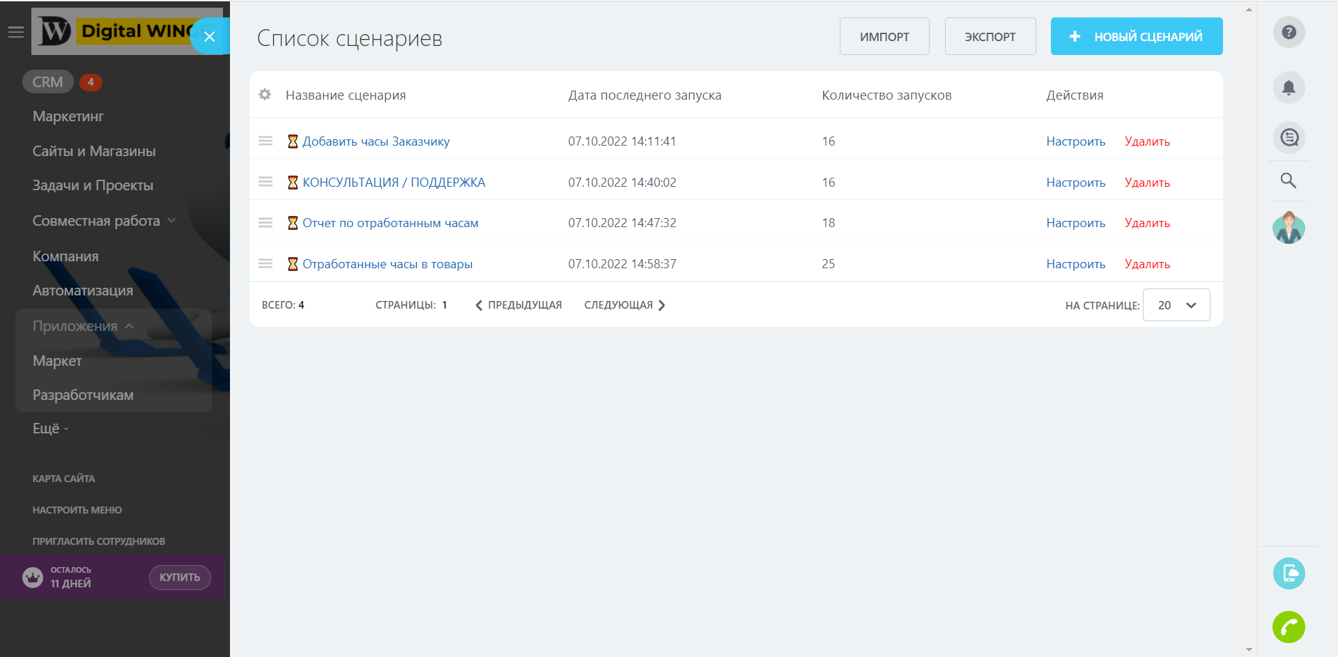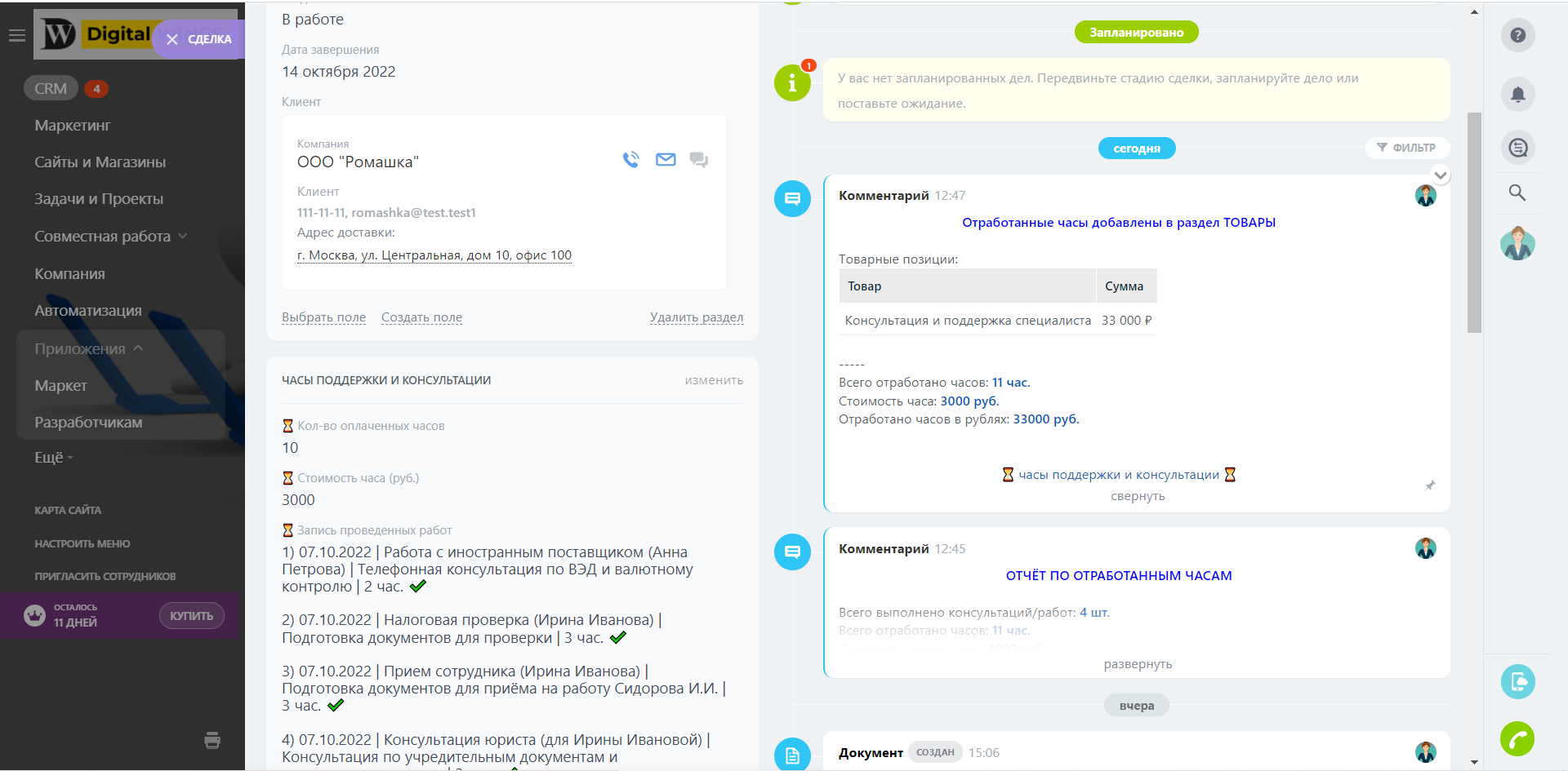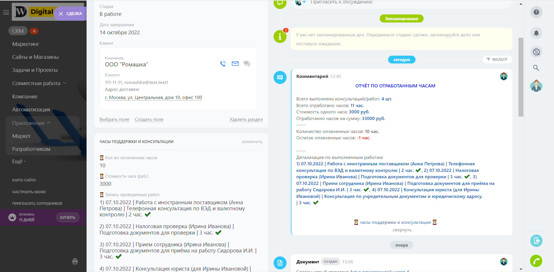 Приложение "Часы поддержки и консультации" фиксирует в сделках Битрикс24 отработанные часы по консультированию, поддержке, выполненным работам. Расчет отработанных часов, пересчет стоимости сделки, отчет по отработанным часам.
