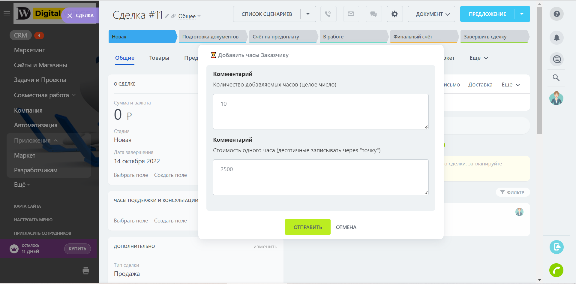 ⏳ Добавить часы Заказчику - Записывает (добавляет) в сделку количество оплаченных часов и стоимость одного часа.