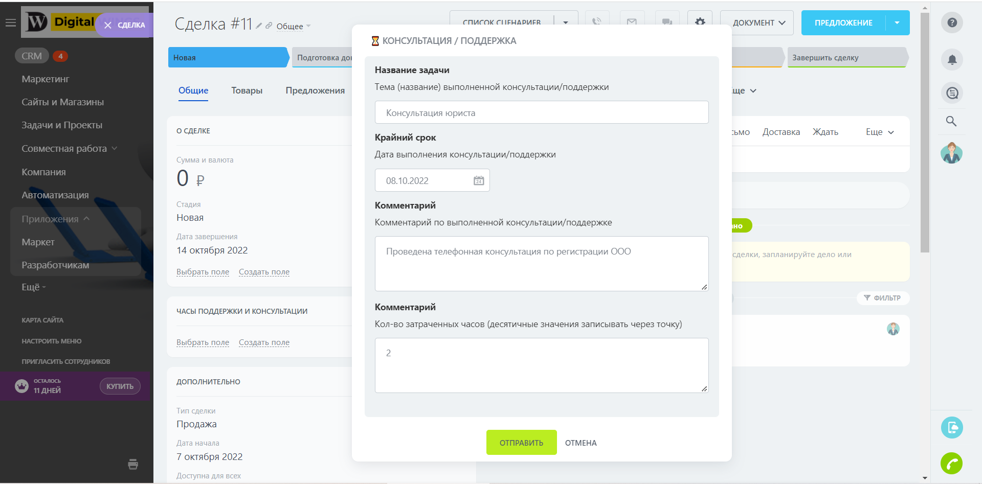 ⏳ КОНСУЛЬТАЦИЯ / ПОДДЕРЖКА - Записать проведенную консультацию (поддержку). Фиксируется название, комментарий, дата и количество затраченных часов.