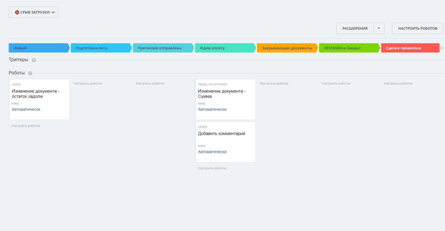 - Стадия "Претензия отправлена" - на эту стадию переносим сделку после формирования и отправки Акта о срыве Заказчику