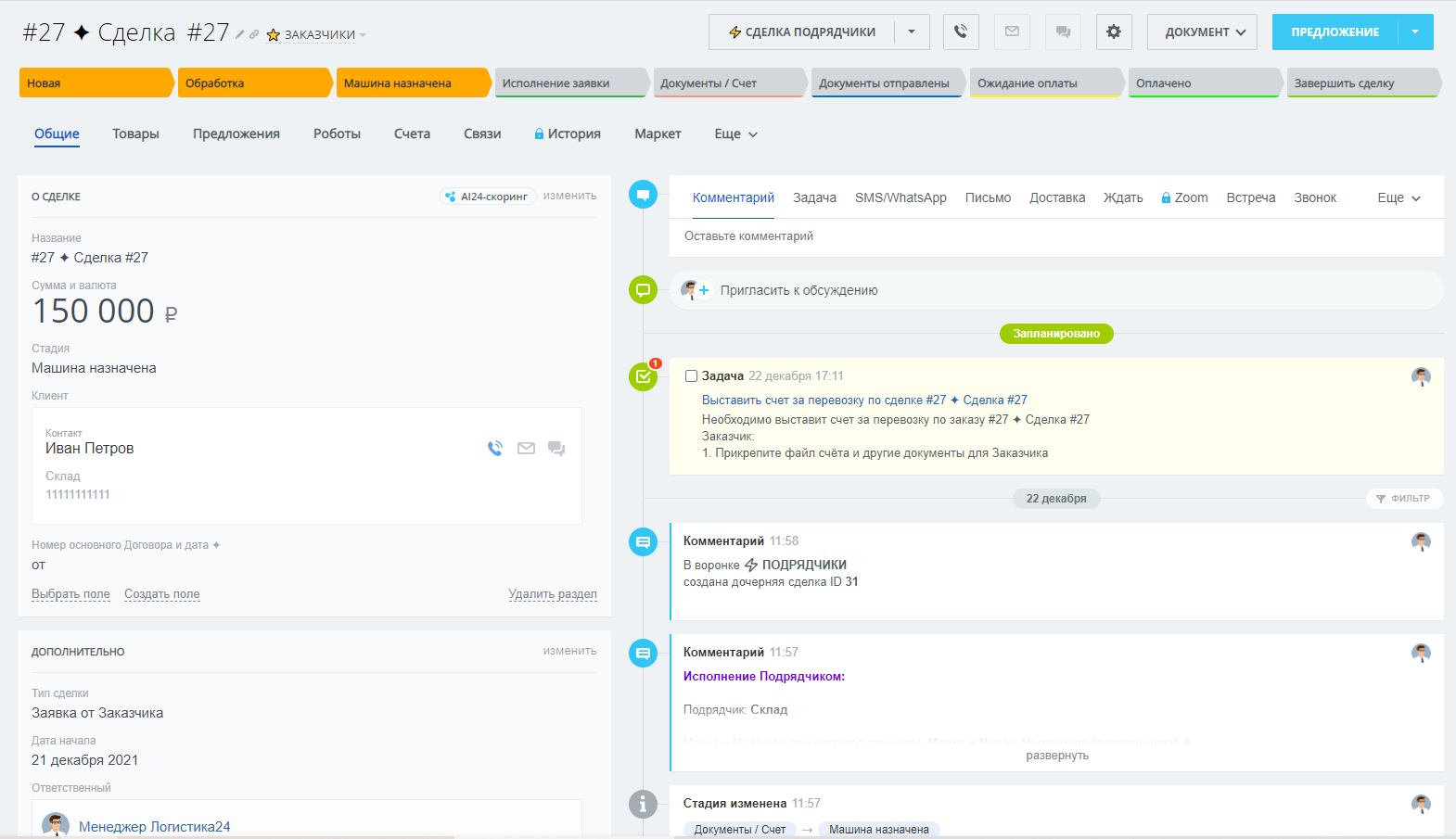 - Стадия "Новая" - создание сделки на исполнение перевозки Подрядчиком / уведомление ответственному