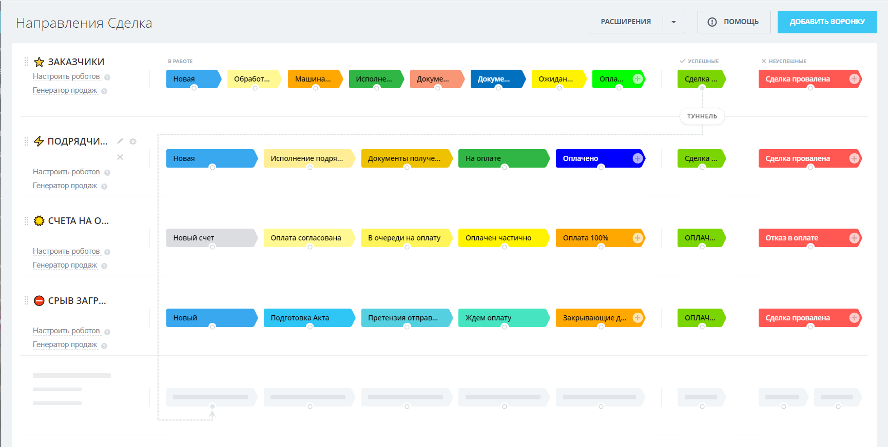 3. воронка "Счета на оплату" (рабочее место бухгалтера, каждая сделка - это счет от Подрядчика)