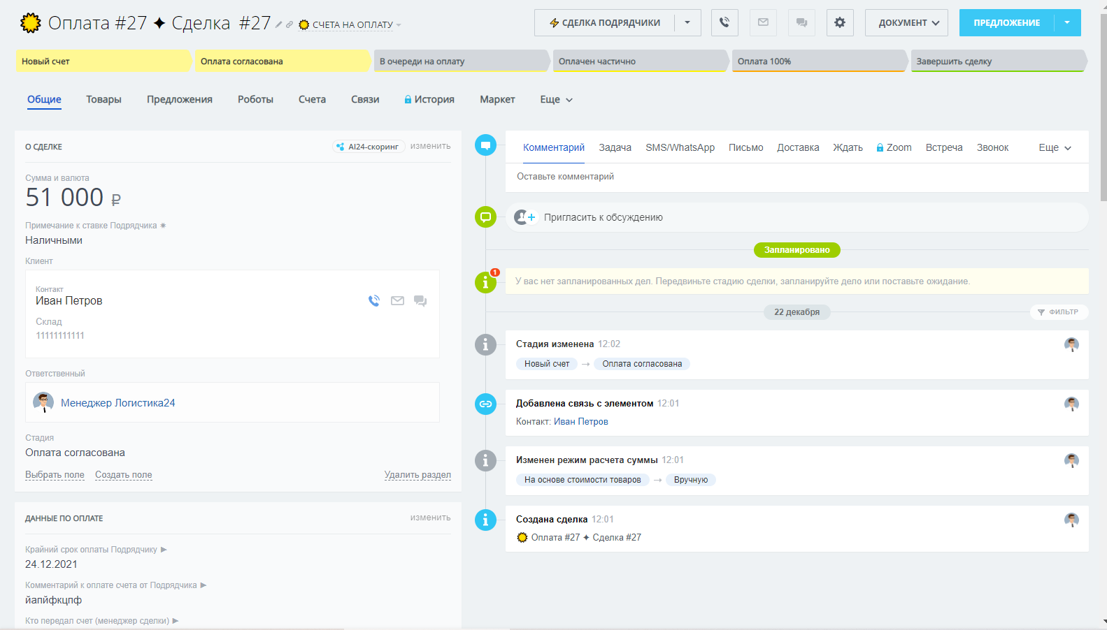 - Стадия "Оплата согласована" - заполнение обязательных полей: "Ответственный за оплату (бухгалтер)" / автоматическая смена ответственного по сделке и уведомление менеджеру, что оплата согласована