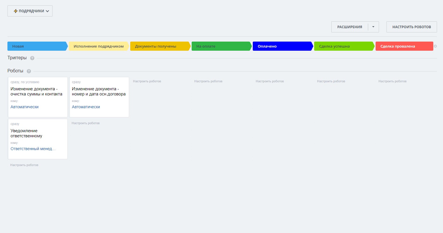 - Отдельно направление (воронка CRM) для работы с расходами счетами от Подрядчиков.
