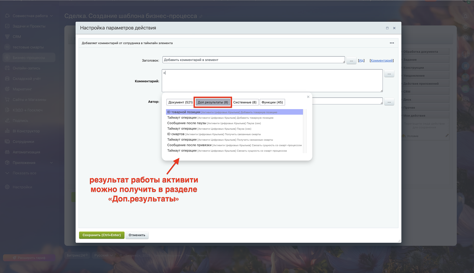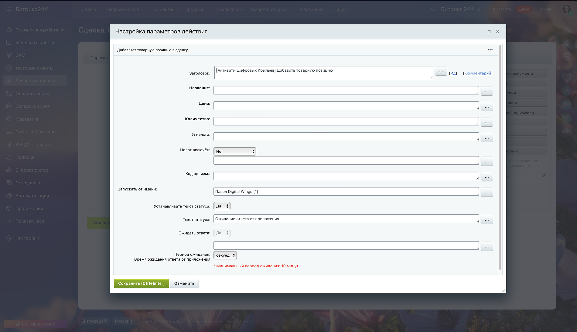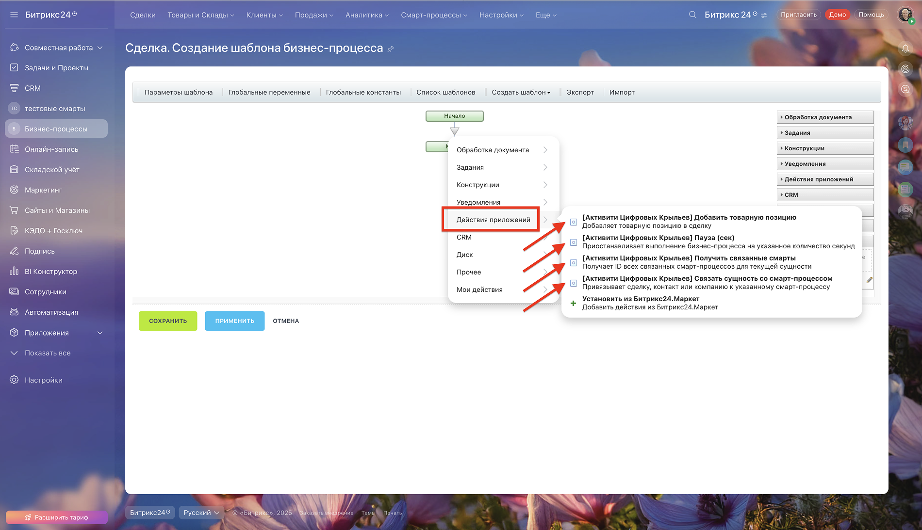 Управляйте связями смарт-процессов, создавайте секундные паузы и автоматически формируйте товарные позиции в сделках. Расширенные активити для профессиональной автоматизации бизнес-процессов.