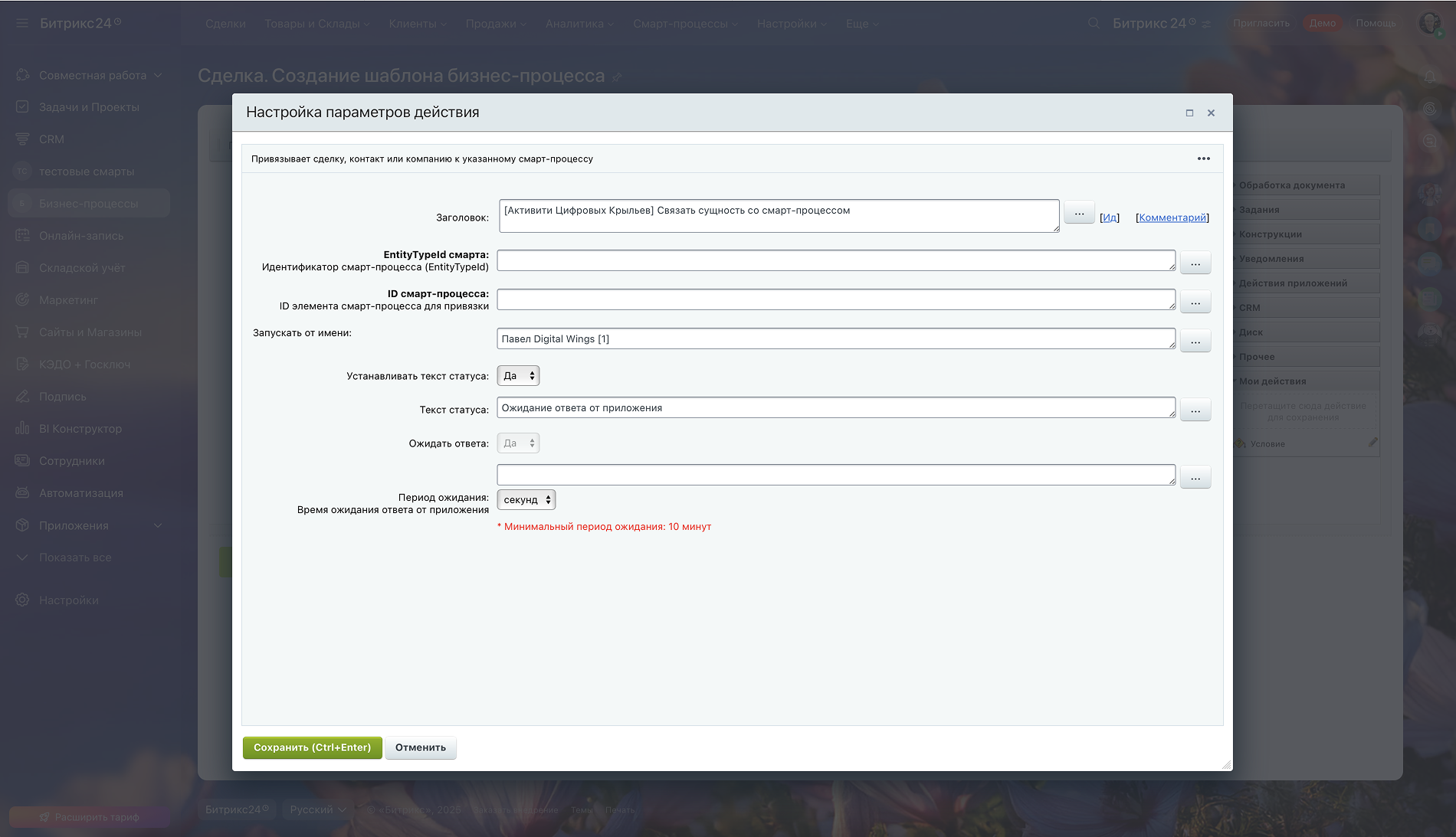 • “Связать сущность со смарт-процессом” – автоматическая привязка сделок, контактов или компаний к смарт-процессам.