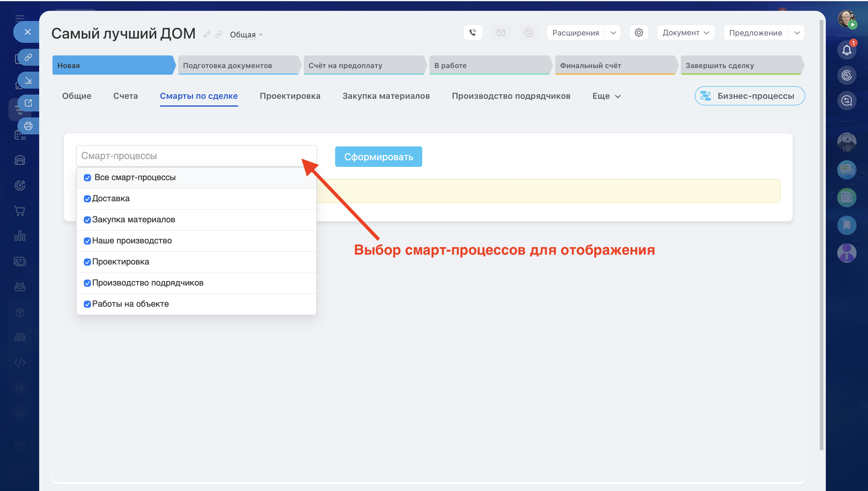 Моментальный отчет и редактирование всех связанных смарт‑процессов прямо в сделке!