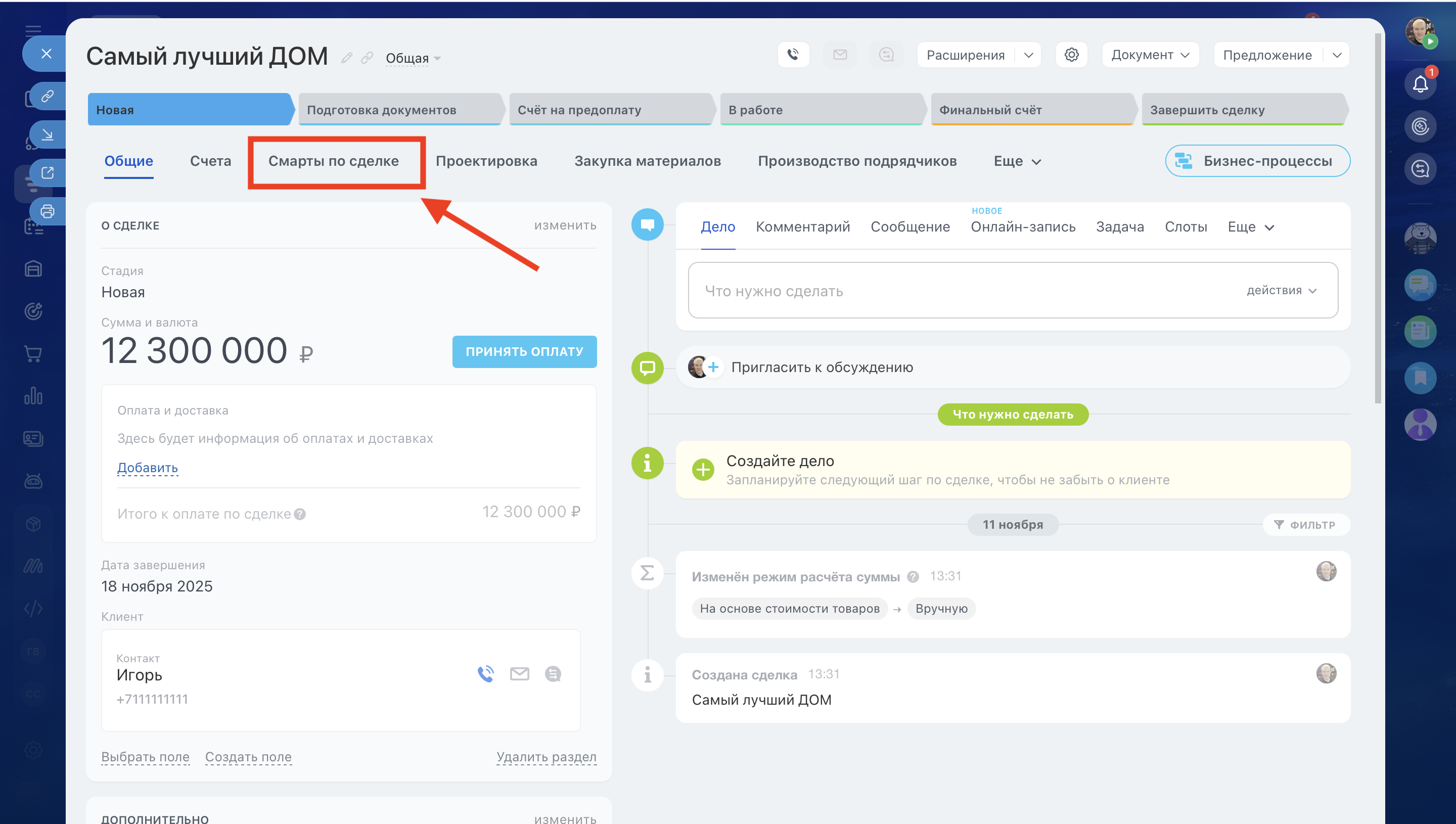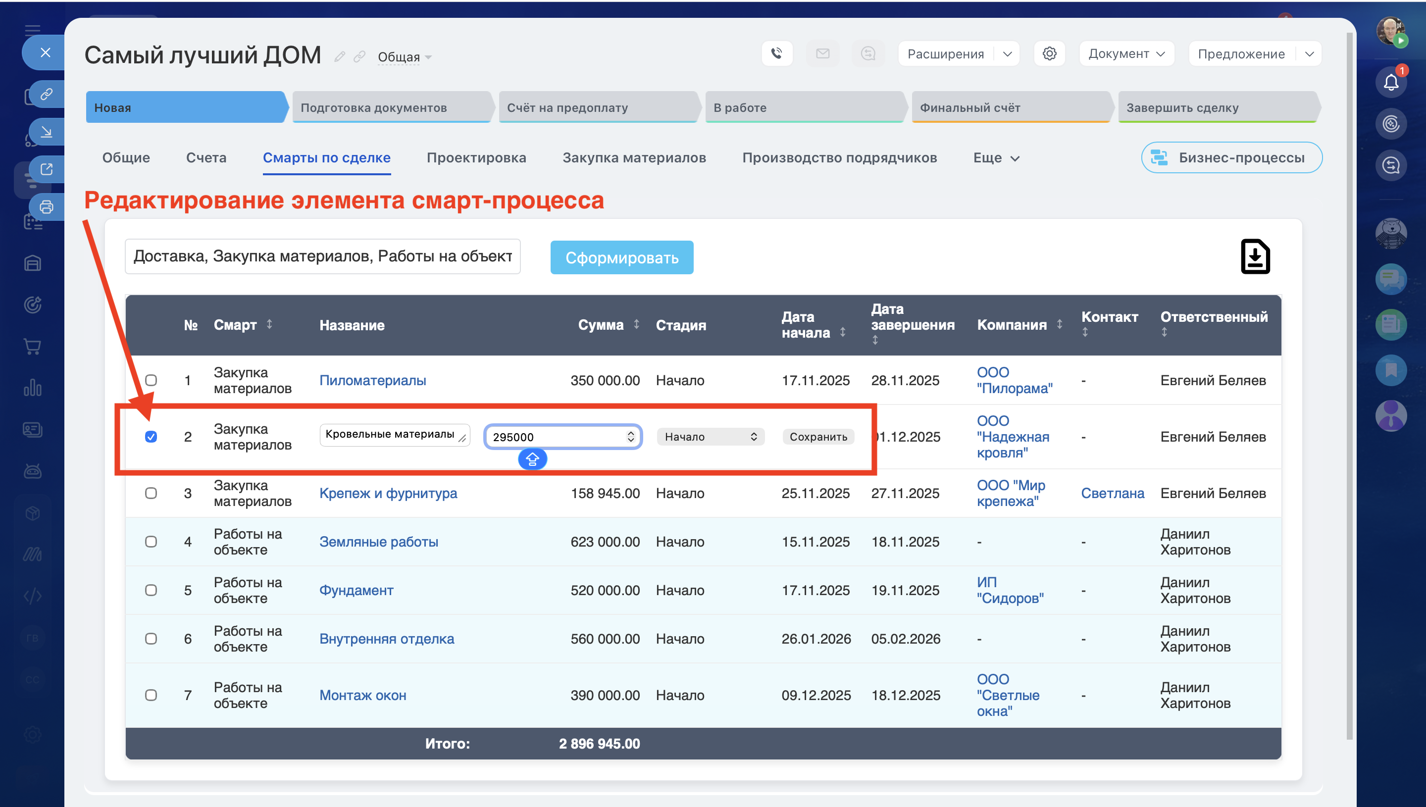 - Мгновенное редактирование названия, суммы и стадии смарт‑процесса прямо в сделке.