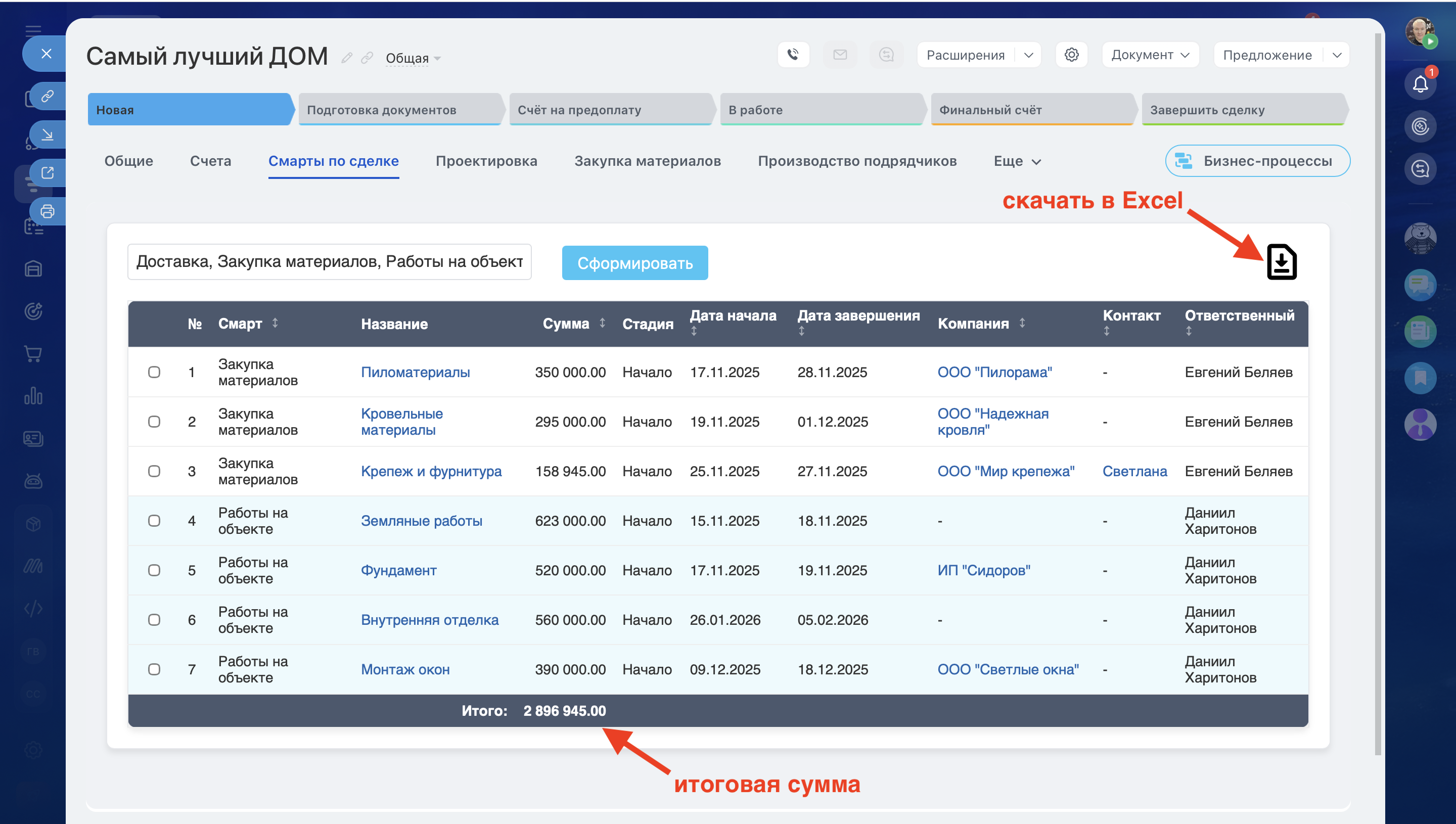 - Вся информация по смарт‑процессам — суммы, стадии, даты, ответственные, компании.