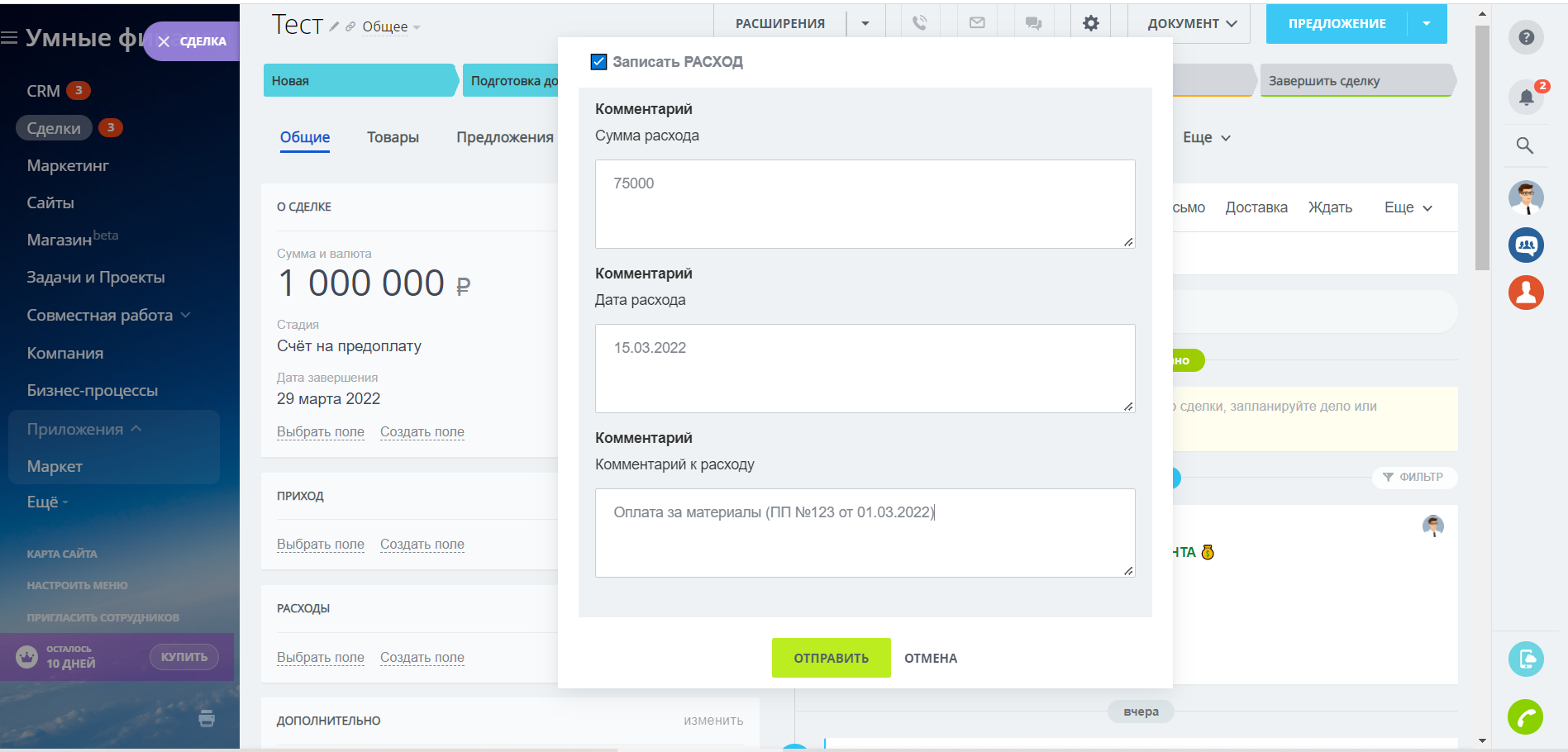 - ☑️ Записать РАСХОД - сценарий записывает в сделку сумму, дату и комментарий к расходу. Вычисляет сумму "Расходы всего" и выводит в комментарий информацию о расходе.