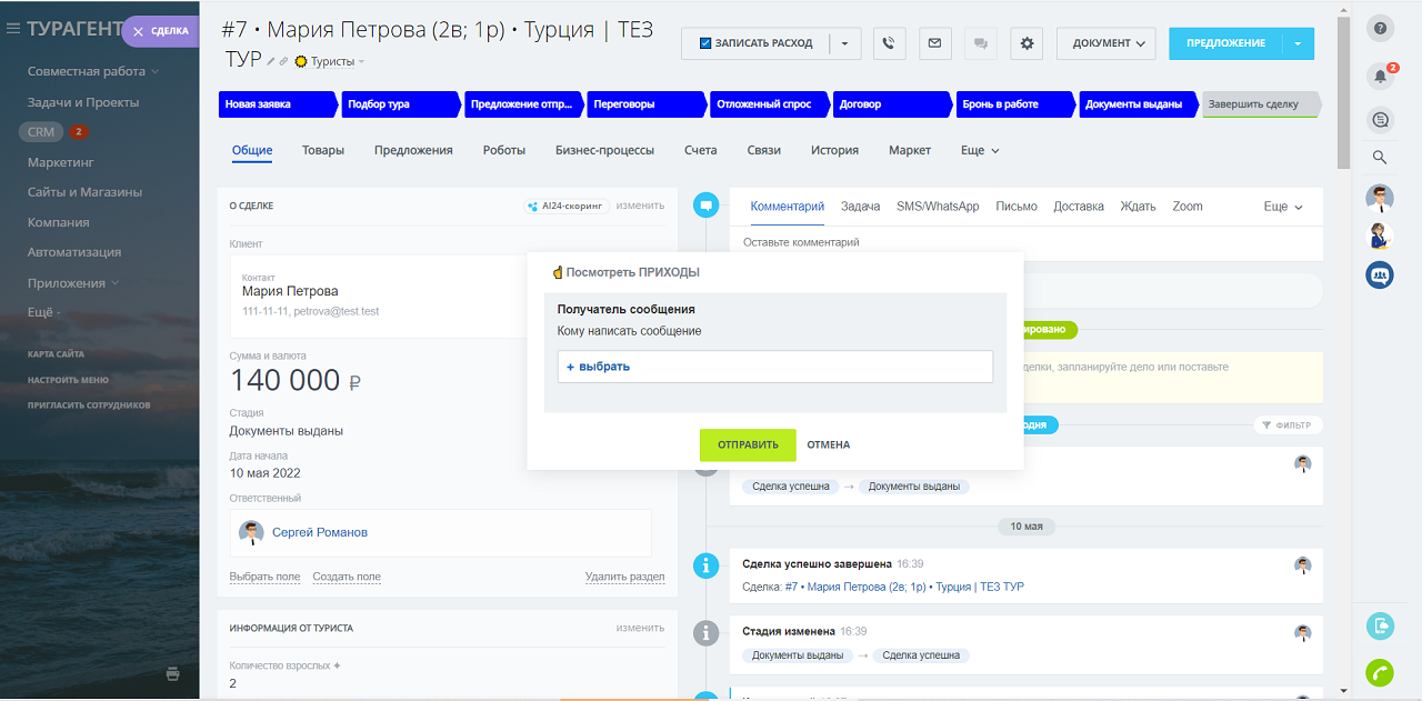 - ☝ Посмотреть ПРИХОДЫ – сценарий выводит в уведомление и комментарий информацию обо всех поступлениях денежных средств от Туриста по текущей Сделке (для сделок в воронке ТУРИСТЫ)
